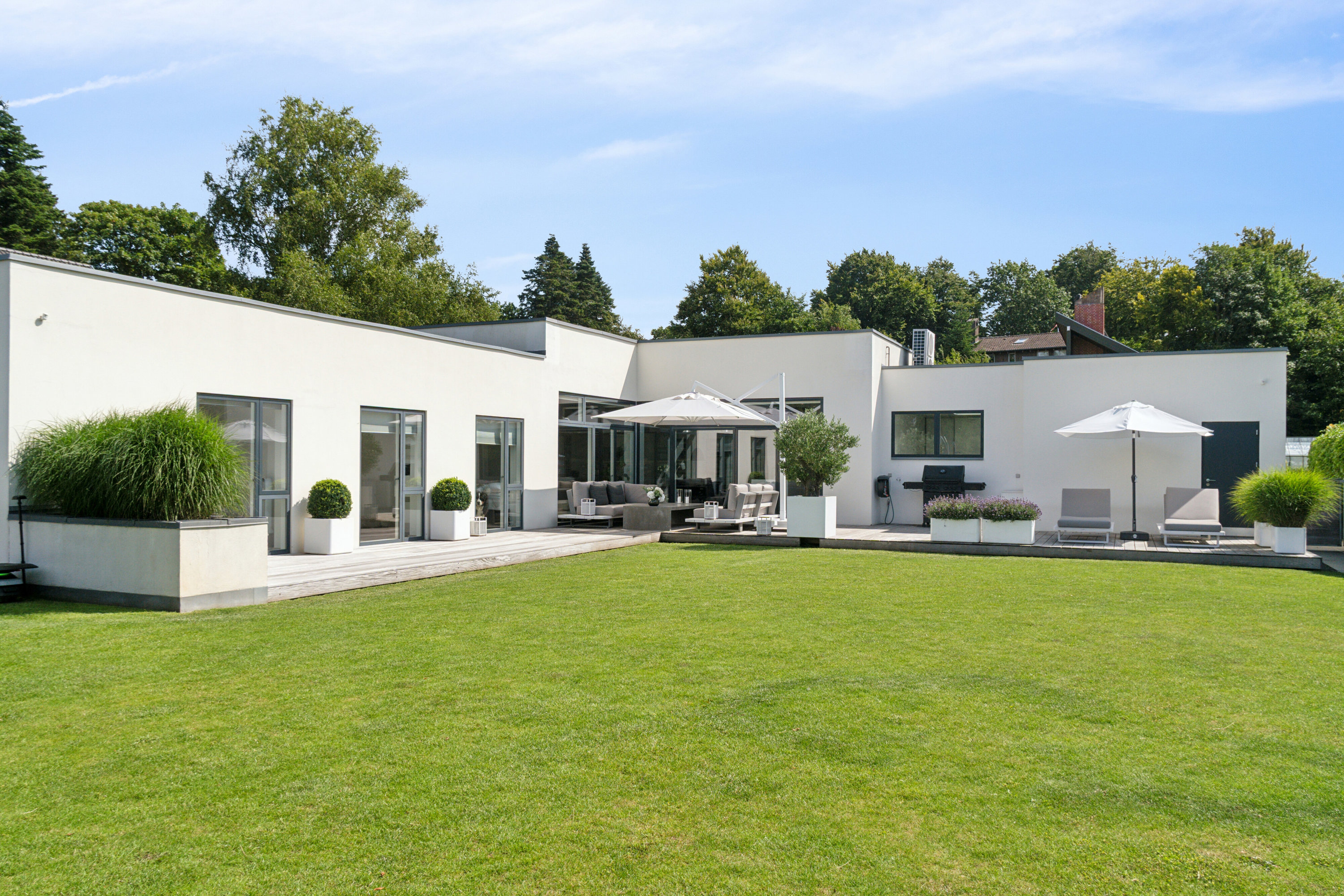 Sirligheden og det stilistiske udtryk er ført med ud i haven, der bærer præg af rene linjer og orden. Træterrassen er orienteret mod vest og tilgås fra garagen, to steder i opholdsrummet samt tre af værelserne.