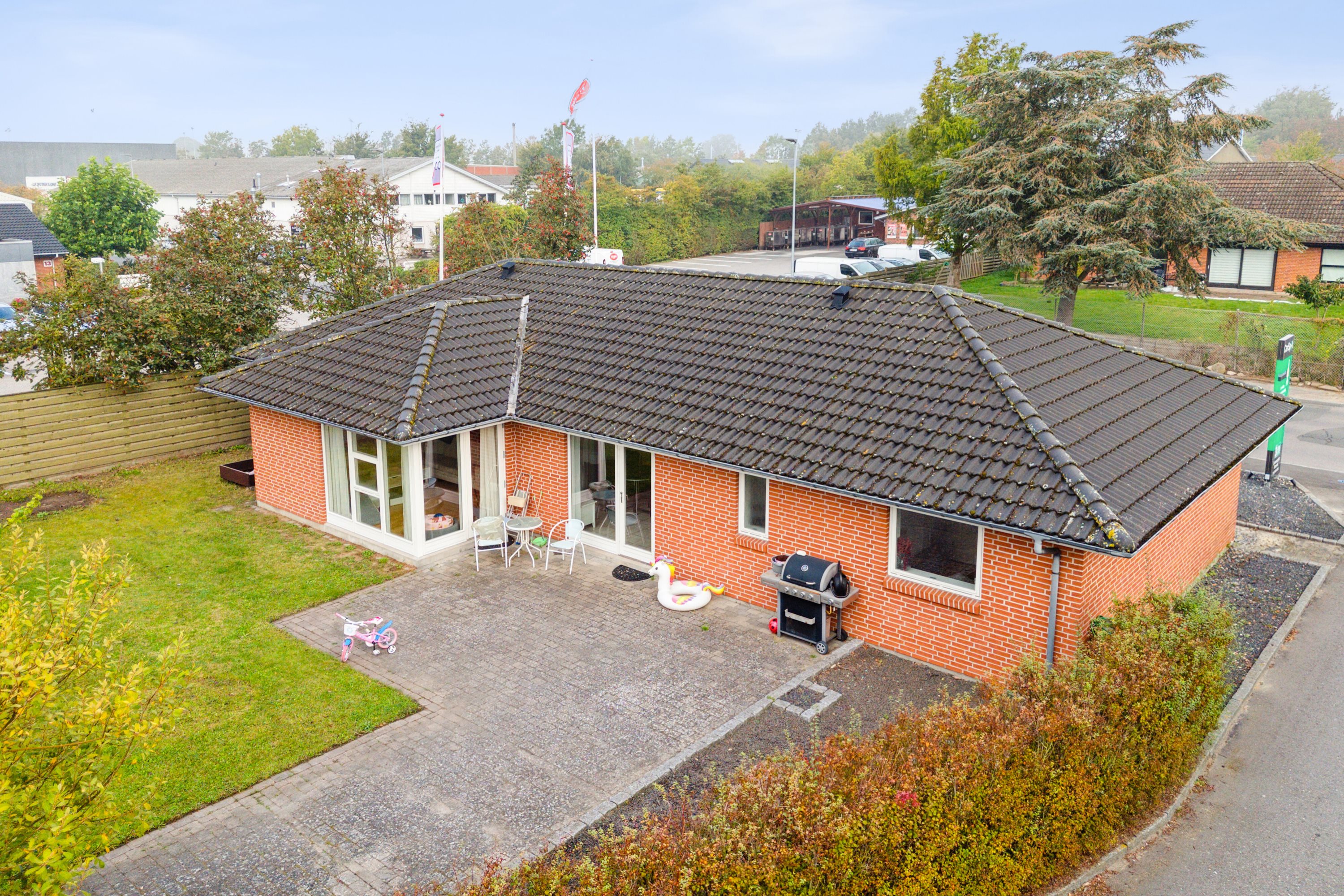 Om sommeren er det den solrige terrasse, der bliver det yndede samlingspunkt. Her kan I se frem til sol fra syd og øst, hvilket gør terrassen oplagt til frokost i det fri. Haven er indrammet af hæk og hegn. Bag ved boligen ligger erhvervsbygningen, som rummer gode kontorlokaler, et værksted, køkken og et badeværelse.