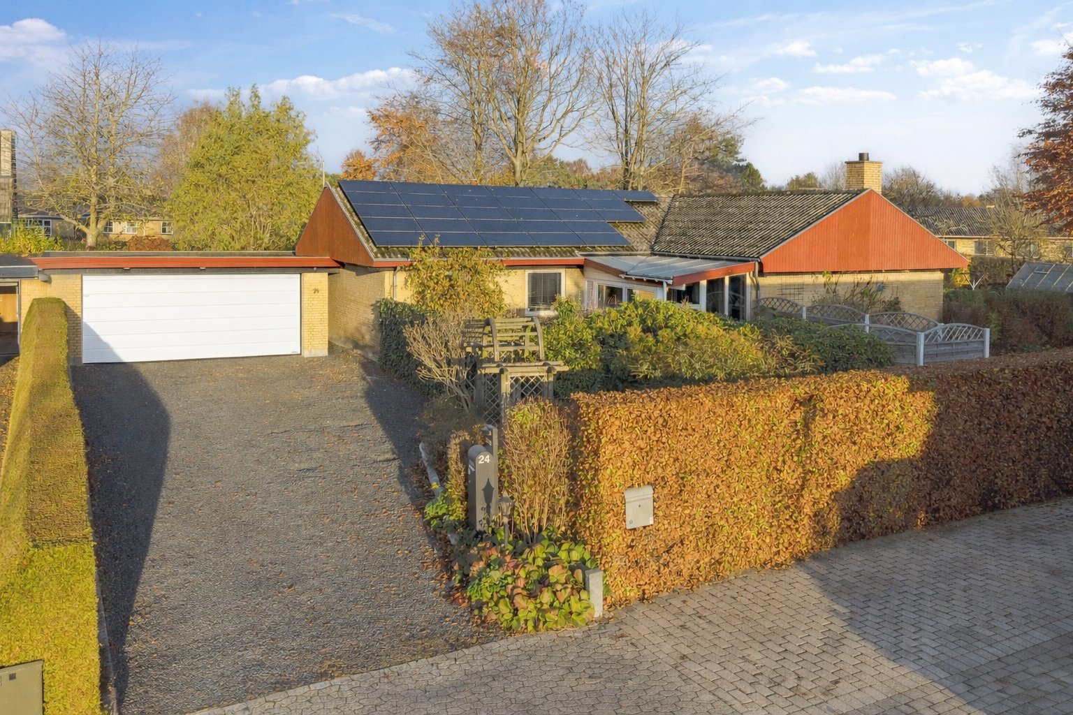 I villaen venter en behagelig atmosfære, hvor udtrykket er klassisk, velholdt og fuld af charme. Boligens hjerte er den store vinkelstue med muret pejs, som udgør det primære opholdsrum og samlingssted. Side om side hermed ligger havestuen, hvor du kan nyde lyset og udsigten til haven året rundt.