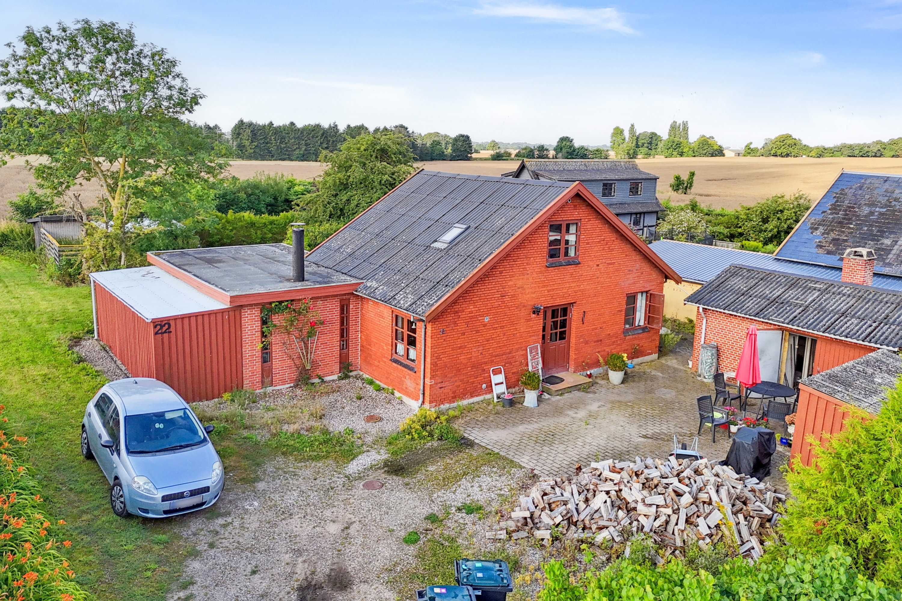 Udenfor får I fornøjelsen af en skøn have, hvor I kan arrangere havemøblerne på den sydvestvendte terrasse. Herfra er der kig til haven, som byder på græsplæne og varieret beplantning, og dertil hører også et redskabsskur, et brændeskur samt en garage, der er opdelt i to med vaskerum i den ene ende. Haven grænser desuden direkte op til de åbne marker og det omkringliggende landskab, så I altid kan nyde udsigten hertil.