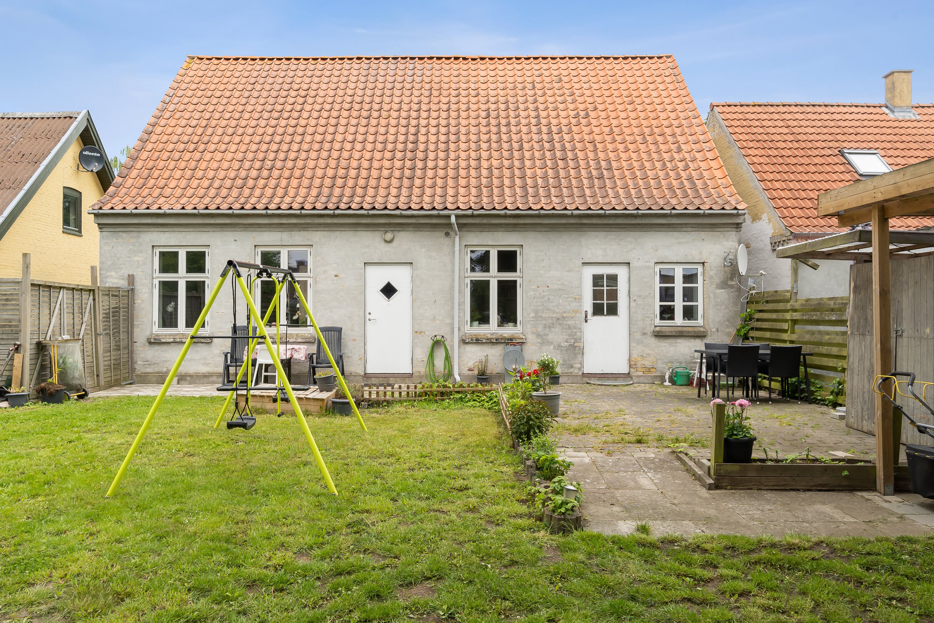 Haven er nem og overskuelig med skygge under det høje træ og mange herlige soltimer på terrasserne. Græsplænen tilfører oasen et grønt præg, og så bliver den alletideres til børnenes leg.