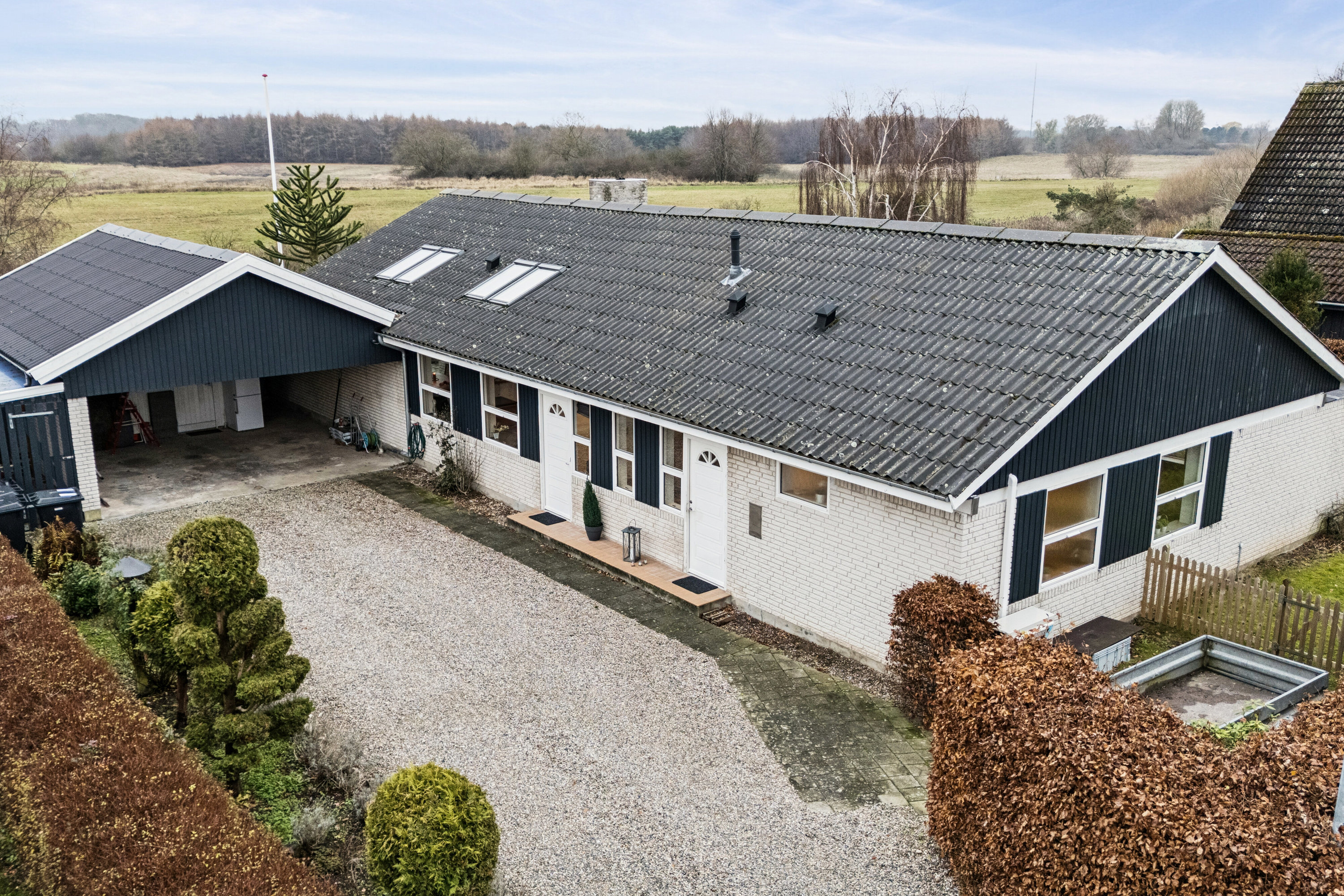 Allerede ved ankomsten mødes man af et ordentligt og indbydende indtryk med gode parkeringsforhold i carporten. Boligen rummer tre værelser, en rummelig stue, to badeværelser, bryggers samt en stor udestue, der forlænger sæsonen og skaber en naturlig overgang mellem hus og have.