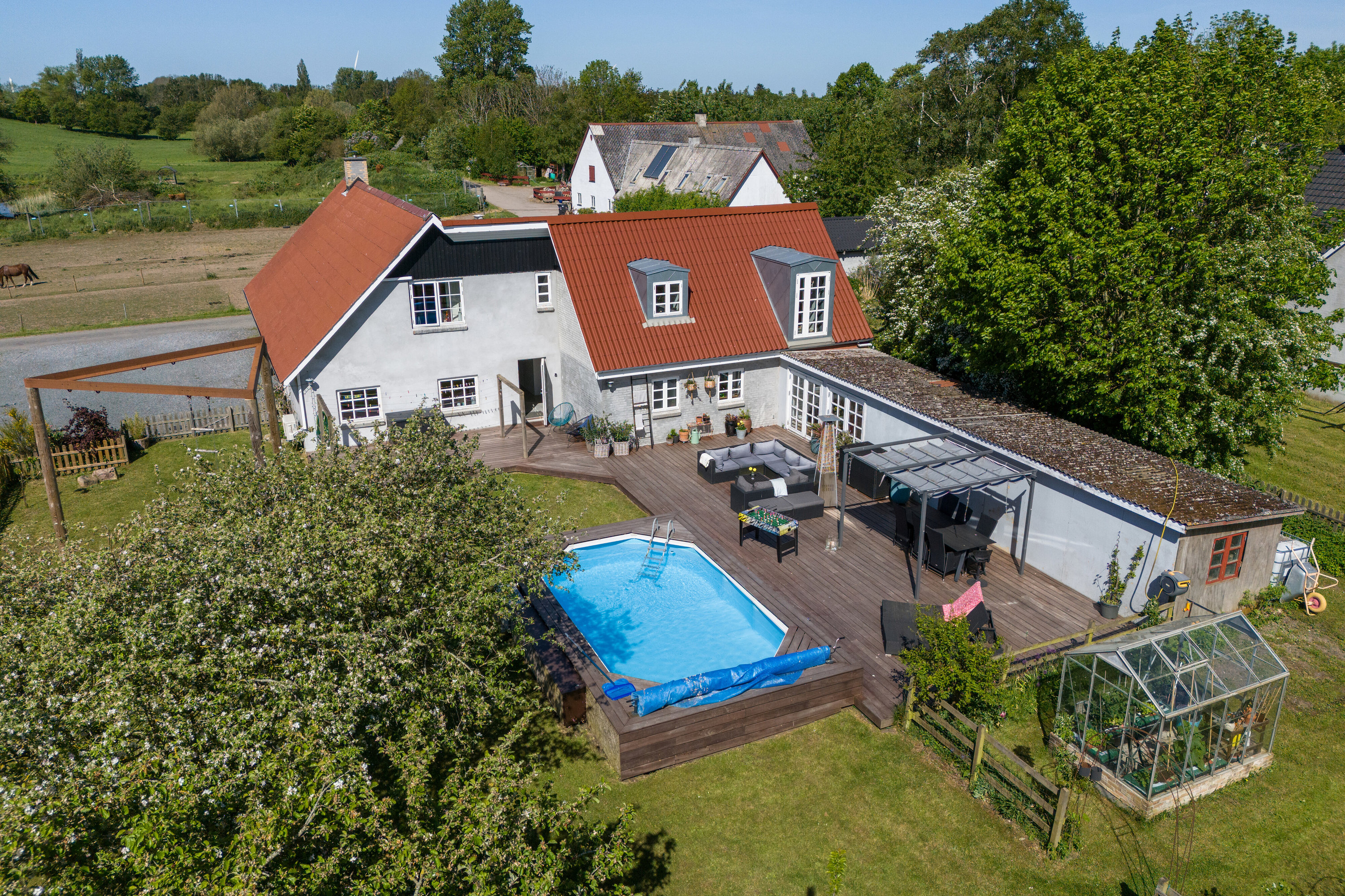 Udover de gode indendørs rammer byder ejendommen på fantastiske udeområder. En dejlig udestue gør det muligt at forlænge sommeraftenerne og nyde udsigten til haven uanset vejret. Udenfor er der anlagt en stor træterrasse, hvor der er plads til loungemøbler, spisebord og hyggelige kroge. Her kan man tilbringe lange sommerdage ved den indbydende opvarmede pool, der indbyder til både leg og afslapning. Haven byder også på et hyggeligt drivhus, perfekt til dig der drømmer om at dyrke dine egne grøntsager eller blot nyde at pusle med planter. Det hele omkranses af smuk natur, der skaber en fredelig og afslappende atmosfære omkring ejendommen.Perfekt kombination af komfort og landlig idyl