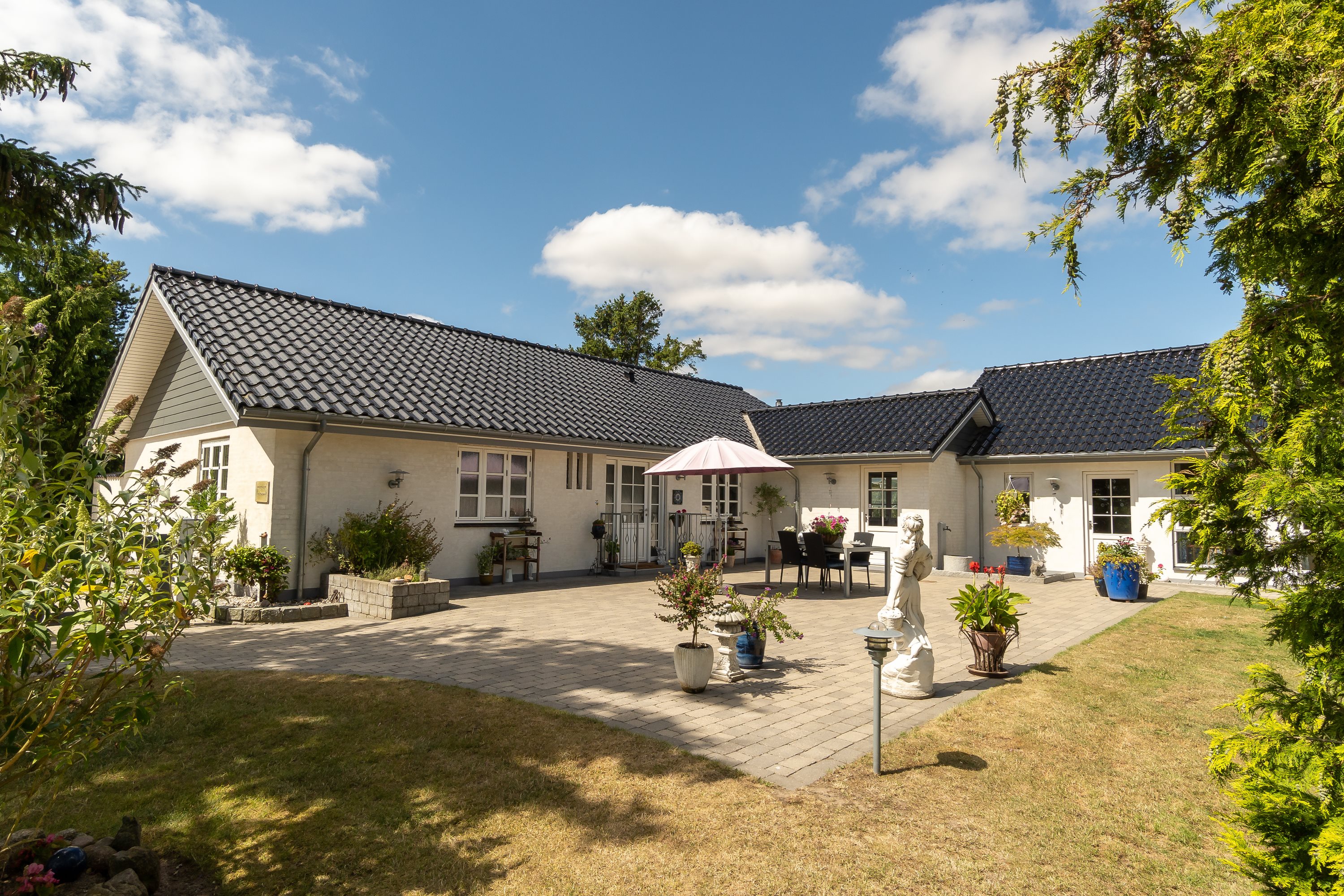 Beliggenheden er intet mindre end fantastisk – med enestående udsigt over åbne marker og kort afstand til golfbanen. Haven er en ren oase, hvor den omkringliggende fliseterrasse giver dig mulighed for at nyde solen hele dagen. Og når aftenen falder på, kan du slappe af i den charmerende pavillon og nyde roen og naturen.