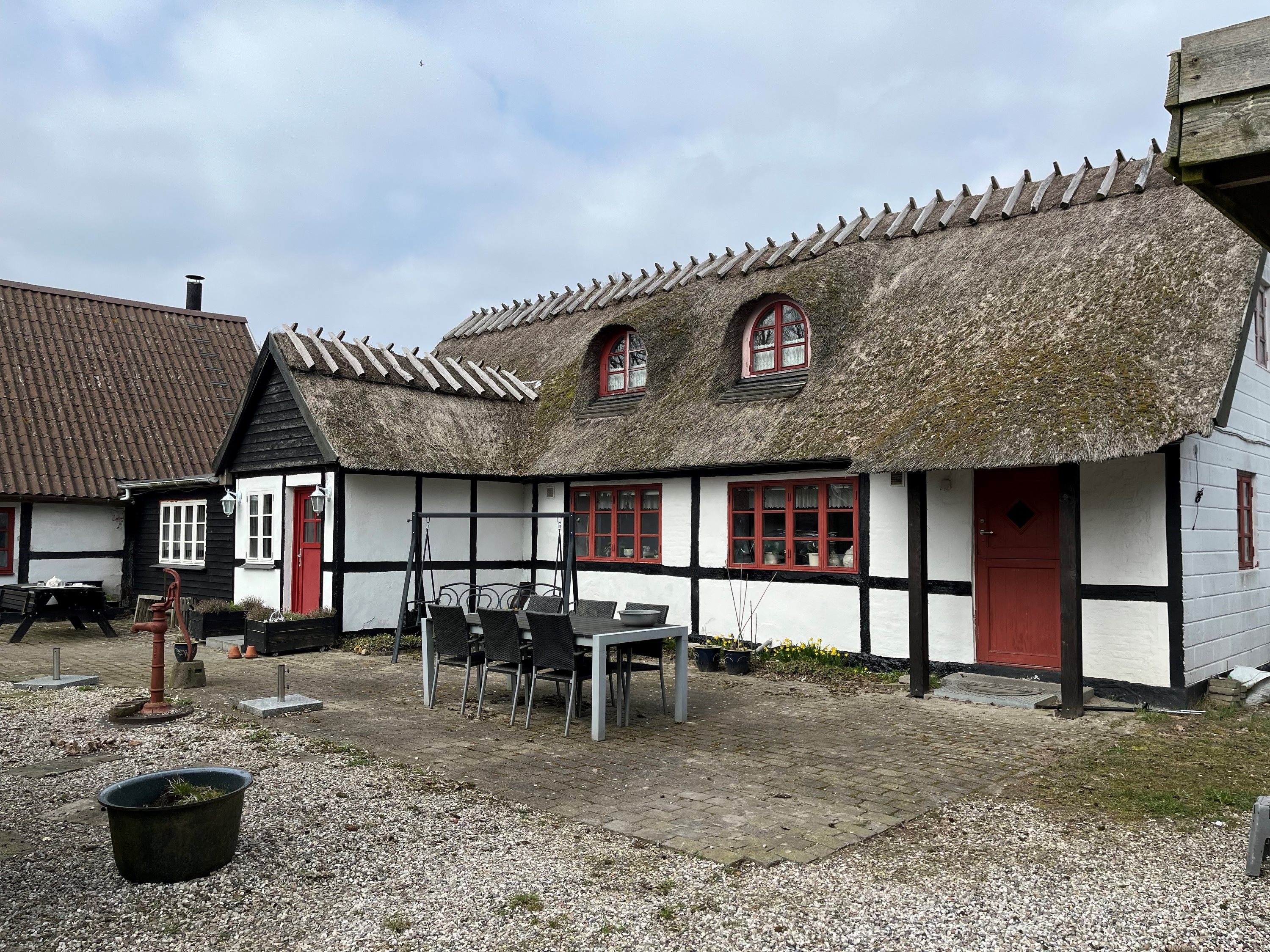 Villaen fra 1897 præsenterer sig med stråtag og sort bindingsværk, der sammen med de fritlagte loftsbjælker indenfor giver hjemmet et charmerende og stemningsfuldt præg. I midten af boligen har I de rummelige opholdsarealer, som tæller et køkken-alrum og en stue. Køkkenet står pænt og lyst med gode opbevaringsmuligheder, og fra alrummet er der dobbeltdøre ind til stuen, hvor I snart har indrettet jer med hyggelige sektioner til samværet.