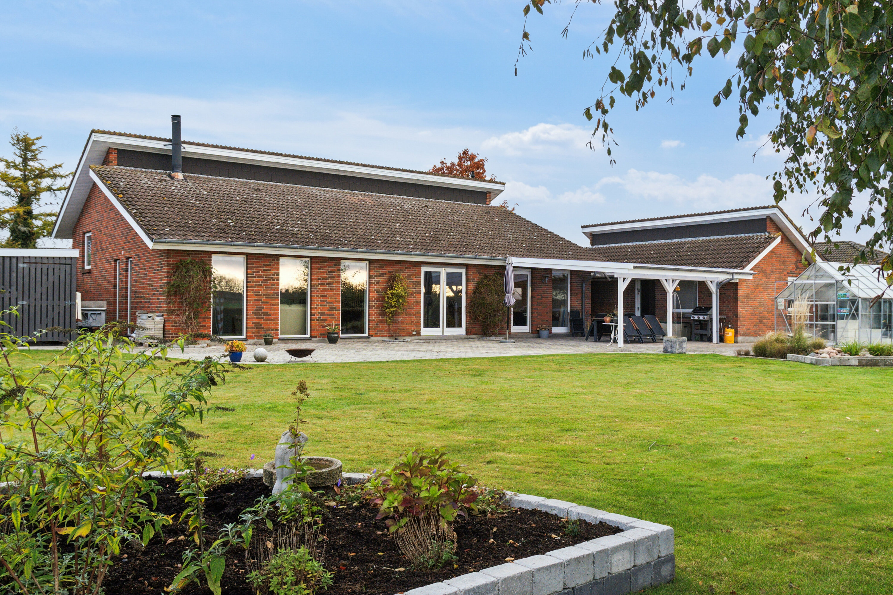 Haven er velanlagt med græsarealer og beplantning, der sikrer privatliv, og der er både drivhus og et fritliggende skur/garage til værksted eller opbevaring. Indkørsel og garage giver plads til flere biler. Kælderen på 70 m² rummer 3 disponible rum og et badeværelse, hvilket giver mulighed for teenageafdeling, hjemmekontor eller hobbyrum med egen indgang fra huset. Denne del øger boligens anvendelighed markant og gør huset velegnet til familier, der ønsker ekstra plads uden at ændre hovedplanen. Kort sagt får I en rummelig villa med gennemtænkte opholdsrum, separate praktiske rum og en stor grund med god privathed og udsigt mod åbent land.