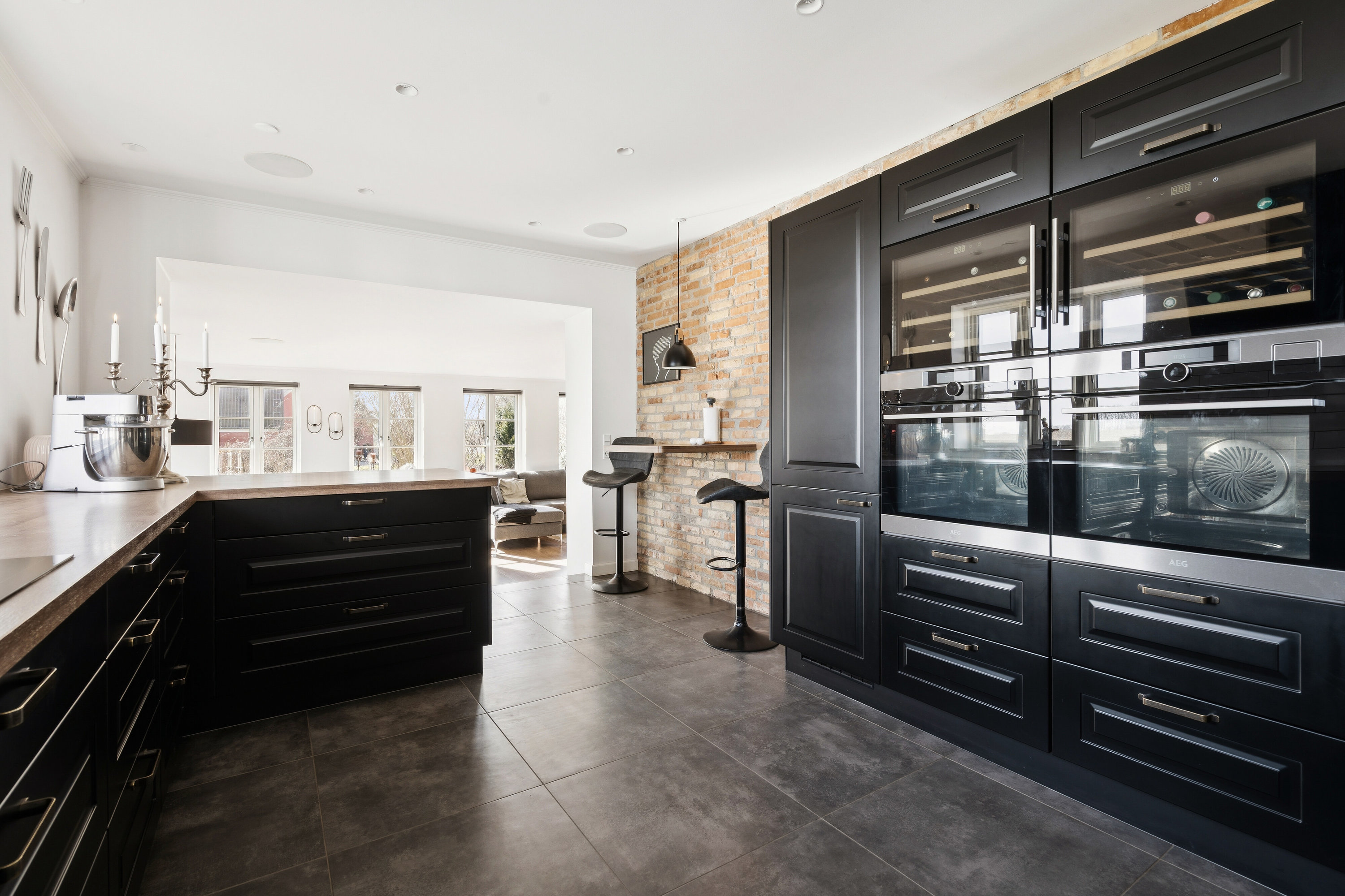Indvendigt emmer det af kvalitet over hele linjen. Huset er renoveret i et moderne udtryk med sans for at bevare visse rustikke elementer. Køkkenet er virkelig flot. Samspillet mellem de sorte elementer, den træfarvede bordplade og de hvide klinker er en fryd for øjet. Køkken-alrummet ligger i skøn sammenhæng med stuen, der får dejlige lysindfald fra flere sider gennem de mange vinduespartier, som samtidig giver en skøn udsigt til omgivelserne. Det stilrene udtryk og det nydelige samspil mellem sort og hvidt fortsætter på badeværelset, der er rummeligt og er indrettet med en separat bruseniche. Der er et lækkert soveværelse i stueetagen, og fortsætter I op på første sal, når I et virkeligt rummeligt værelse, som I uden problemer kan dele op i flere værelse.