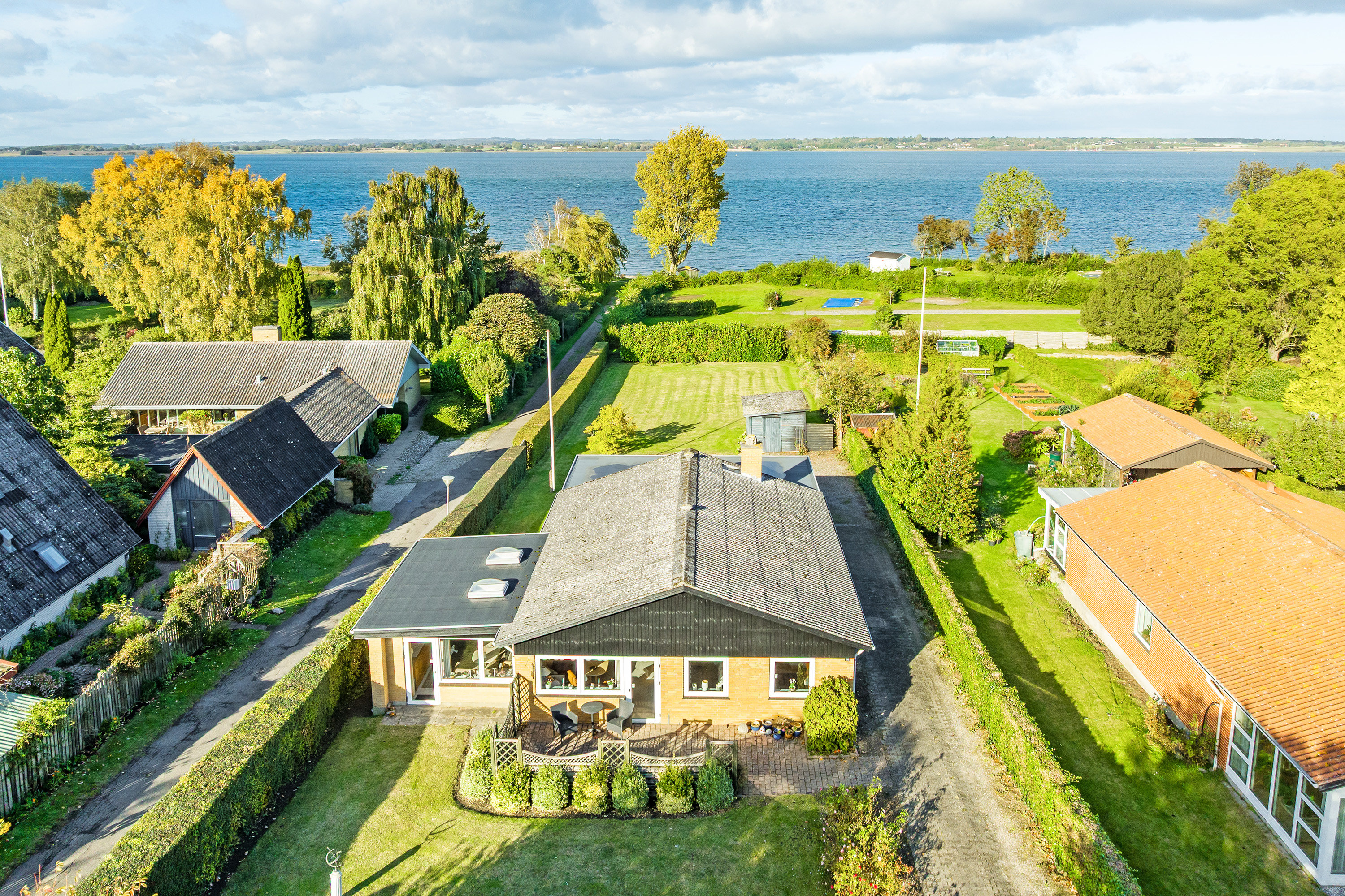 Den store grund er velanlagt og nem at holde, rosenbede, buske, stor græsplæne og med udgang til "Strandstien" med få skridt til vandet og badestranden.