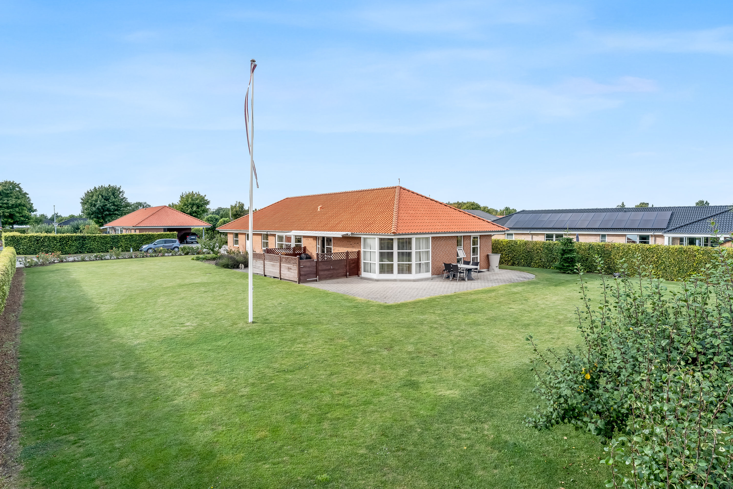 Udenfor venter en lukket og tryg have på 1.369 m², hvor både børn og voksne kan udfolde sig. Her er en solrig fliseterrasse til hyggelige grillaftener, en nem og overskuelig græsplæne samt en charmerende lille frugtlund med æble-, pære- og blommetræer.