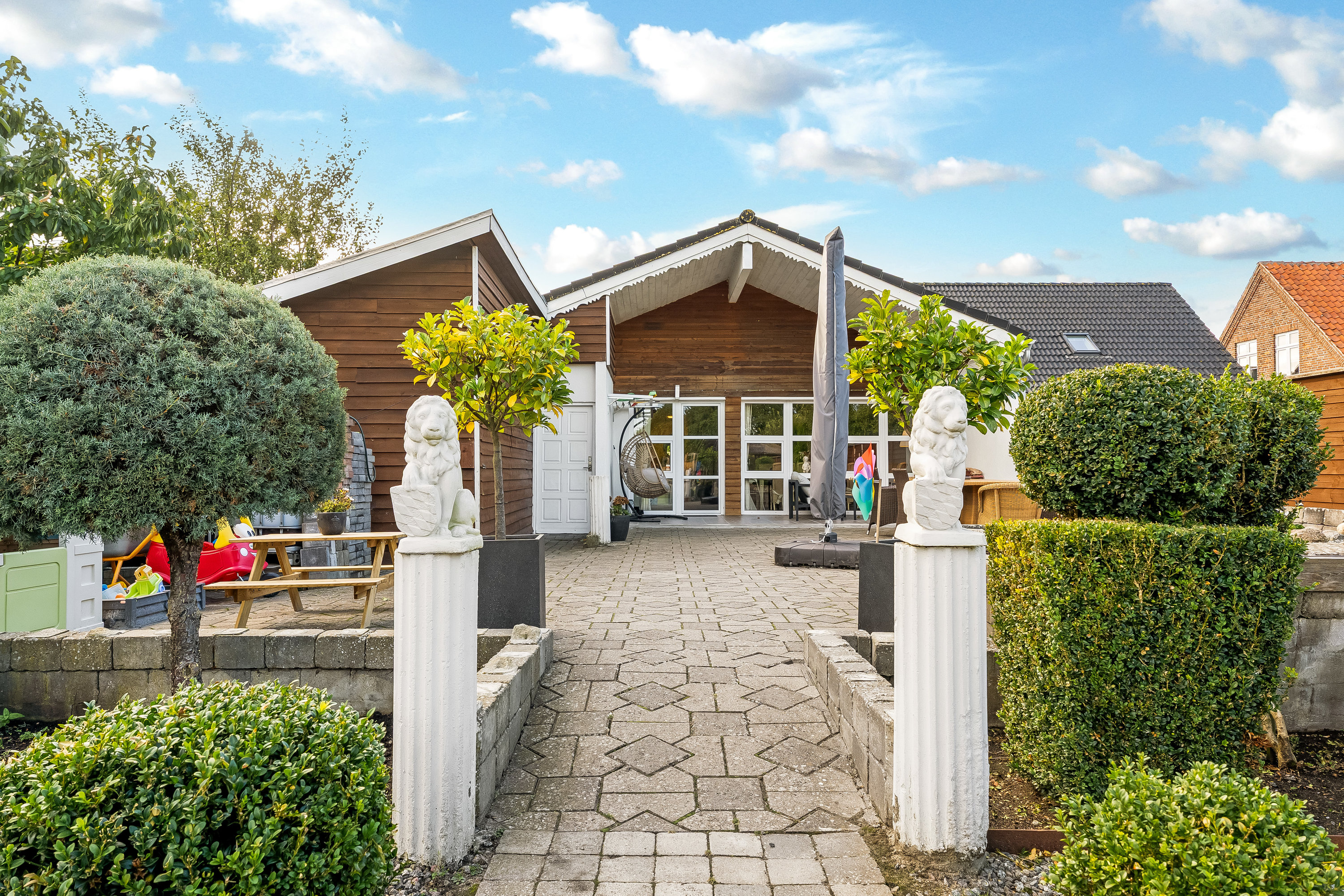 Ejendommen ligger på en skøn, velanlagt og ugenert grund. Haven er indrettet med solrige terrasser, hyggelige kroge, overdækket areal samt græsplæne, der indbyder til leg og boldspil.