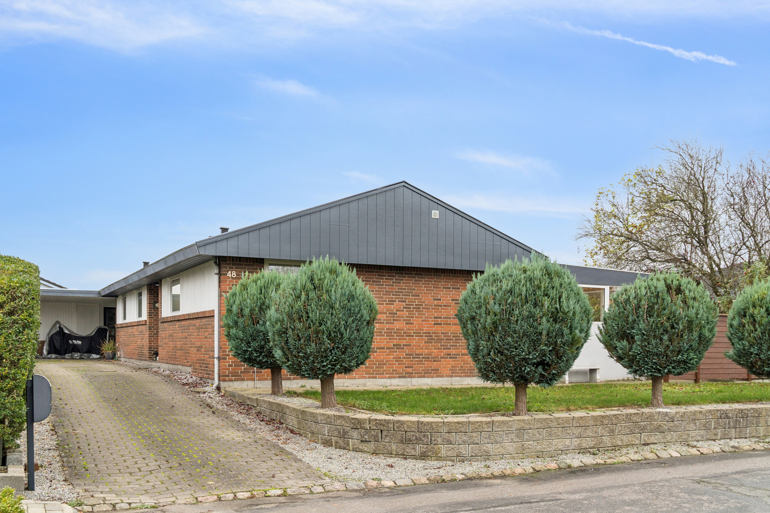 På Rådyrløkken 48 får du en bolig, der rammer den perfekte balance mellem funktionalitet, hjemlighed og tryg beliggenhed. Her møder du en solid, løbende opdateret villa fra 1975, der allerede ved ankomsten giver følelsen af noget velholdt og velfungerende. Den klassiske røde murstensfacade og de sorte tagplader står tidløst, mens indkørslen med carport og den rolige forhave skaber et førstehåndsindtryk af orden, struktur og gode rammer for hverdagen.