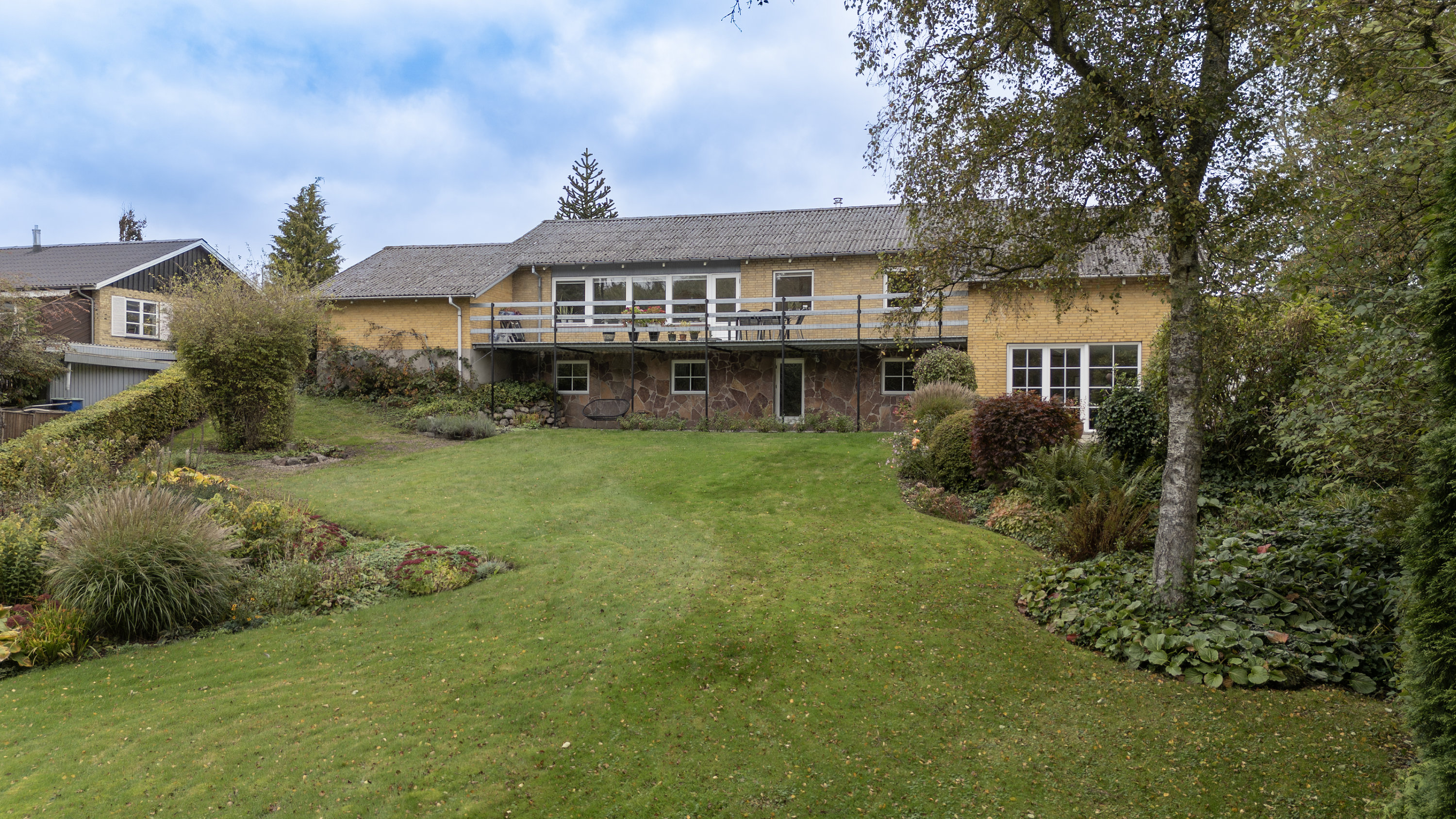 Haven er anlagt i flere niveauer med både vestvendt terrasse, græs, beplantning og små stier – lige til at nyde, men nem at holde.