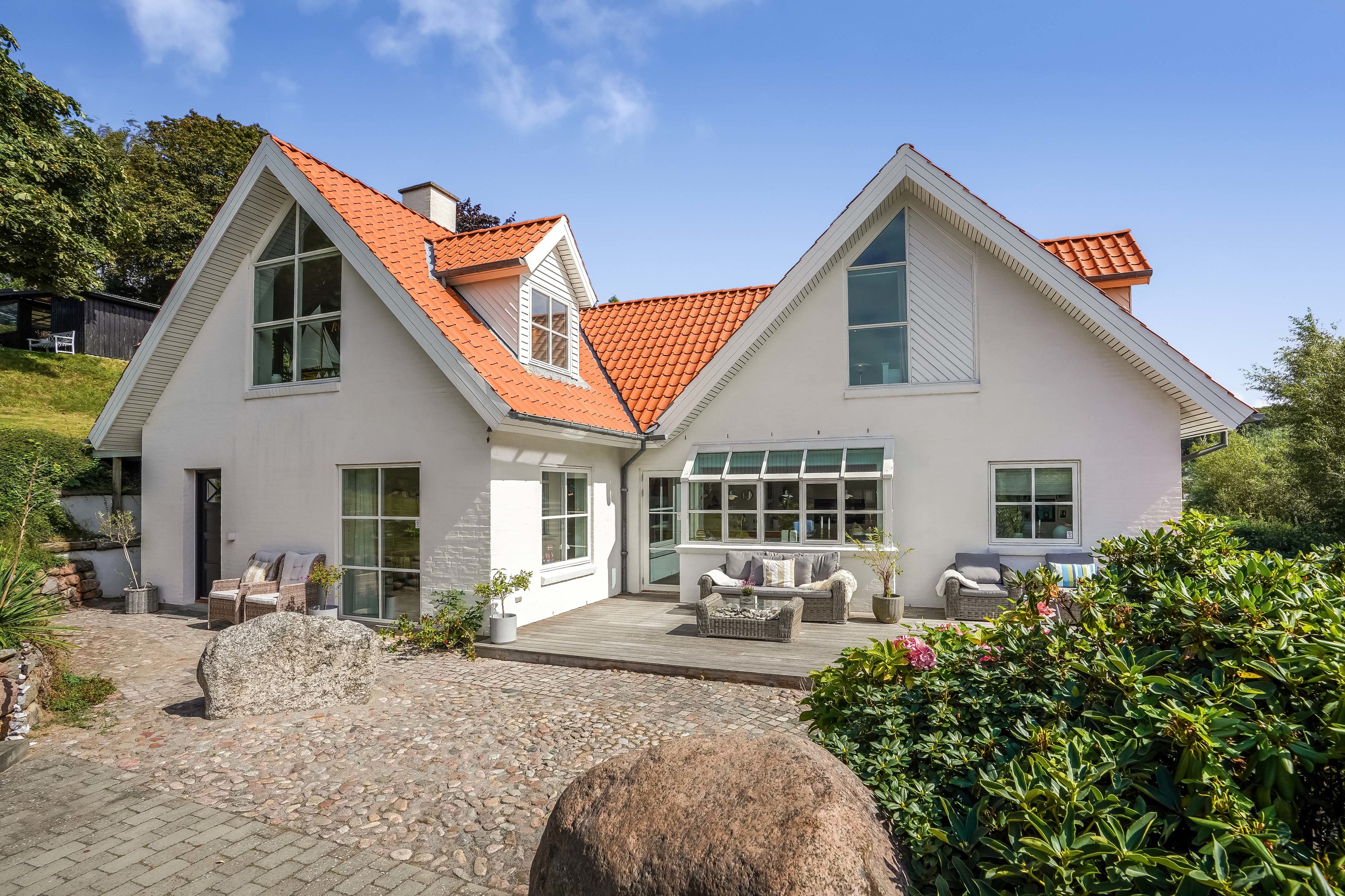 - Dejlig lukket terrasse, fantastisk grund i flere niveauer med panoramaudsigt og egen strand