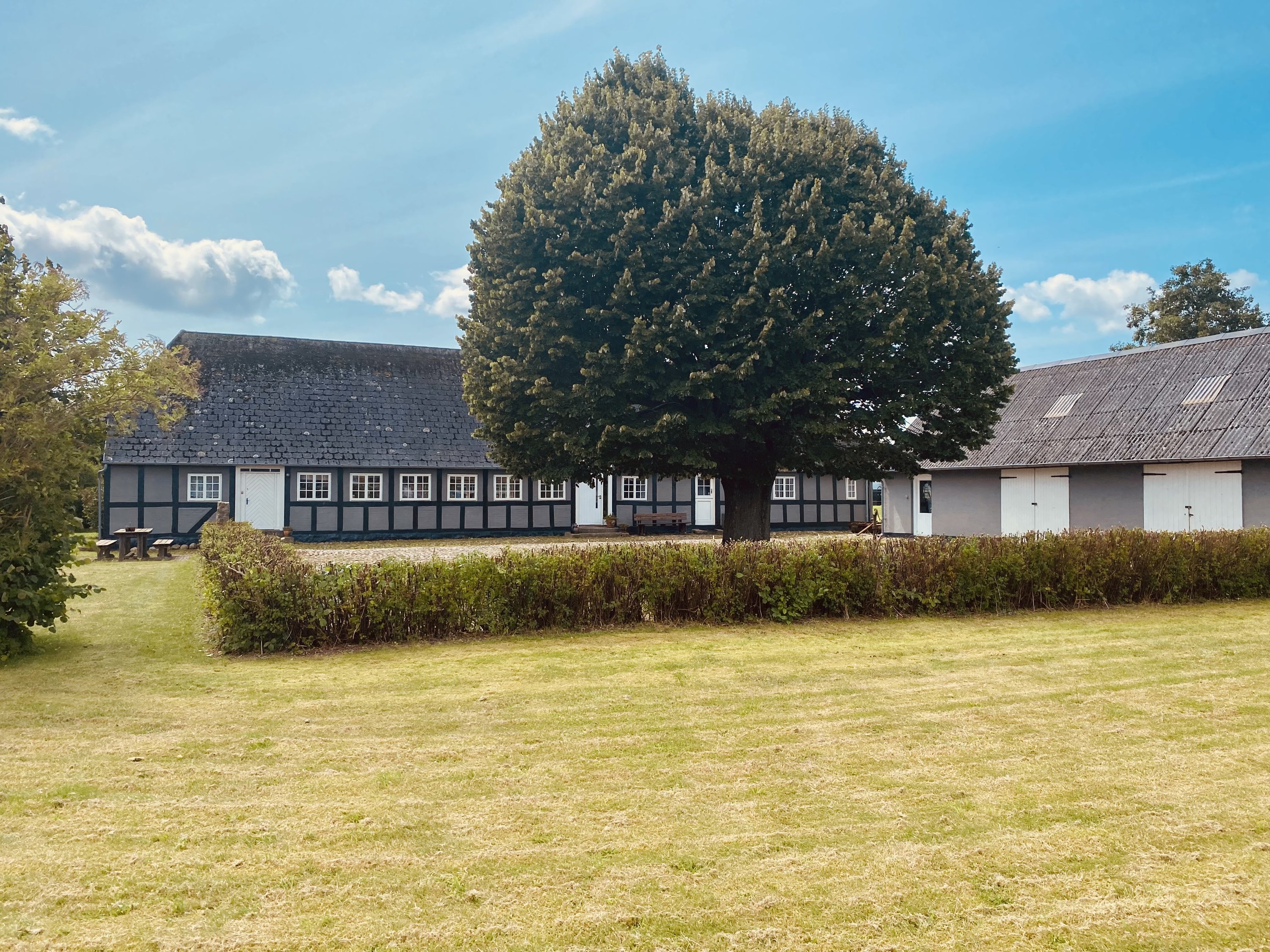 Allerede når I triller bilen ind af den flotte allé, for at blive ført videre til den smukke brostensbelagte gårdsplads, bliver I ramt af ejendommens ubeskrivelige charme. Det flotte "værnetræ" midt i gårdspladsen, det flotte og yderst velholdte bindingsværk og de sprossede vinduer byder velkommen, mens hovedbygningen imponerer i samspil med ejendommens øvrige smukke og velpassede længe.