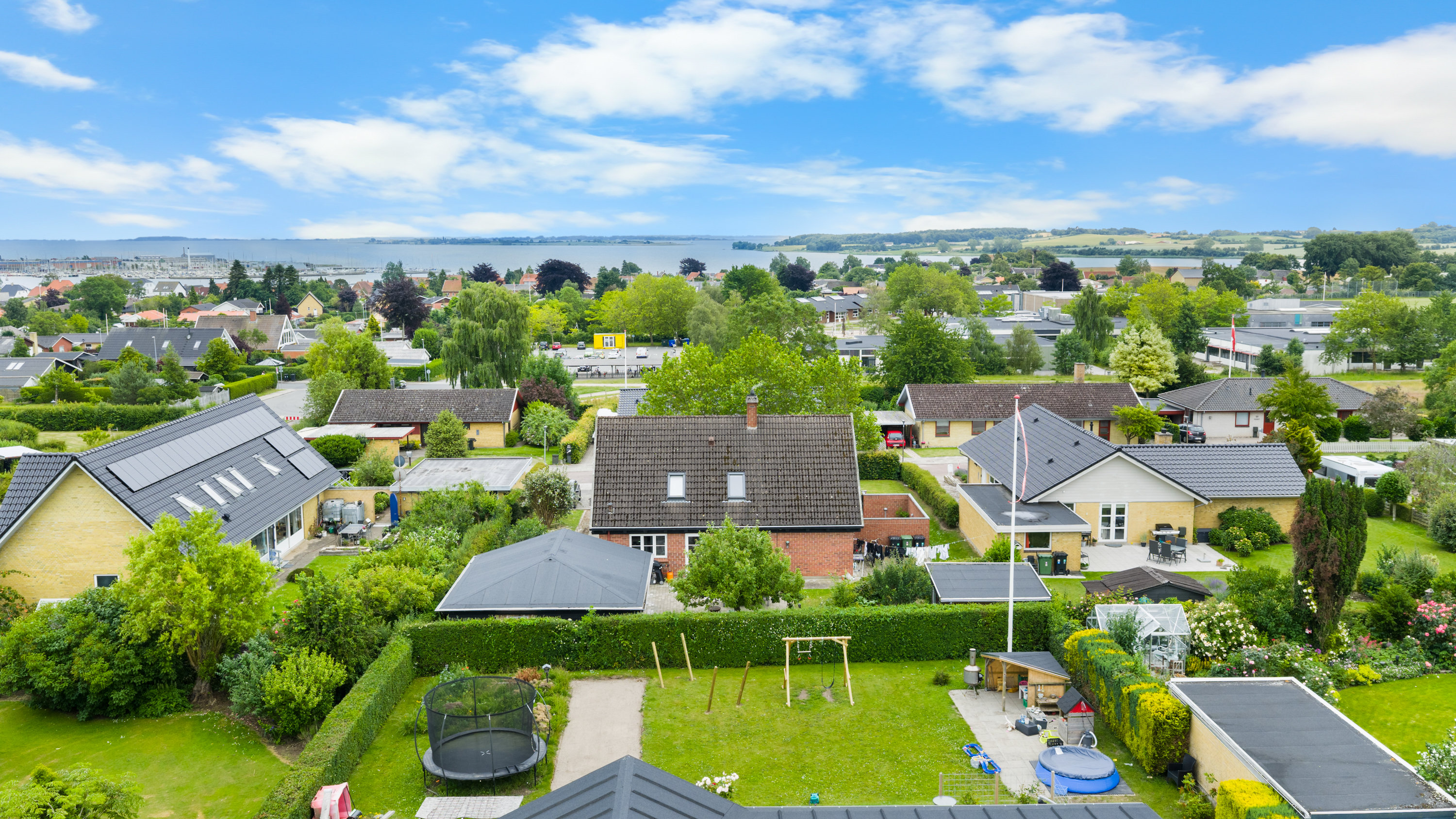 Ejendommen er beliggende i et børnevenligt område med sikre stisystemer til både skole, børnehave, grønne områder og legepladser. Samtidig er du tæt på vandet, og fra husets første sal kan du nyde et smukt kig til det sydfynske øhav.Boligen byder på en god og tidssvarende planløsning. I stueplan finder du en entré og et praktisk bryggers, samt et lyst og stilrent køkken i åben forbindelse til den rummelige stue. Herfra er der direkte adgang til en overdækket og ugeneret terrasse, der forlænger sommeren og skaber ideelle rammer for udeliv og hygge. Et pænt badeværelse med bruseniche og et stort værelse fuldender stueplan.