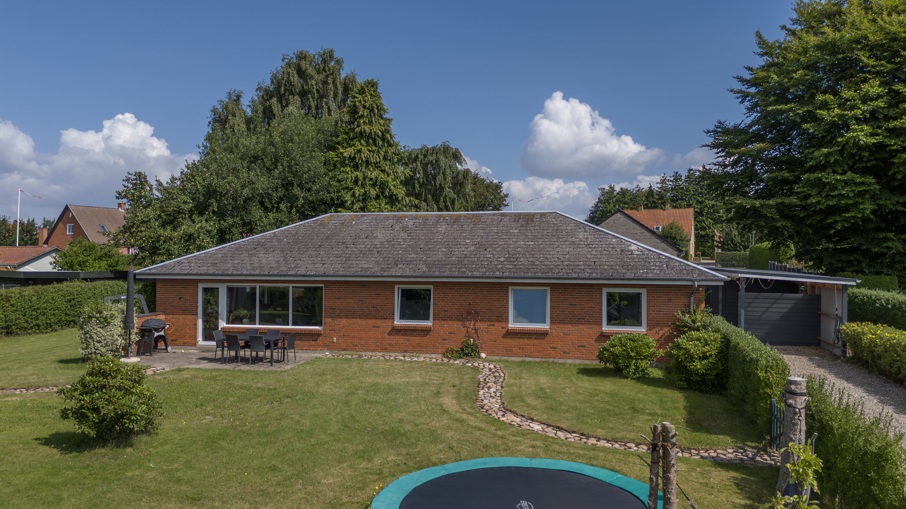 Endnu en af villaens store fordele er den ugenerede terrasse, hvor morgenkaffen kan nydes i solens stråler. Haven er ideel til leg for børnene og tilbyder også plads til afslapning og naturoplevelser. De velholdte udendørsarealer er perfekte til både festlige sammenkomster og stille stunder med familien.
