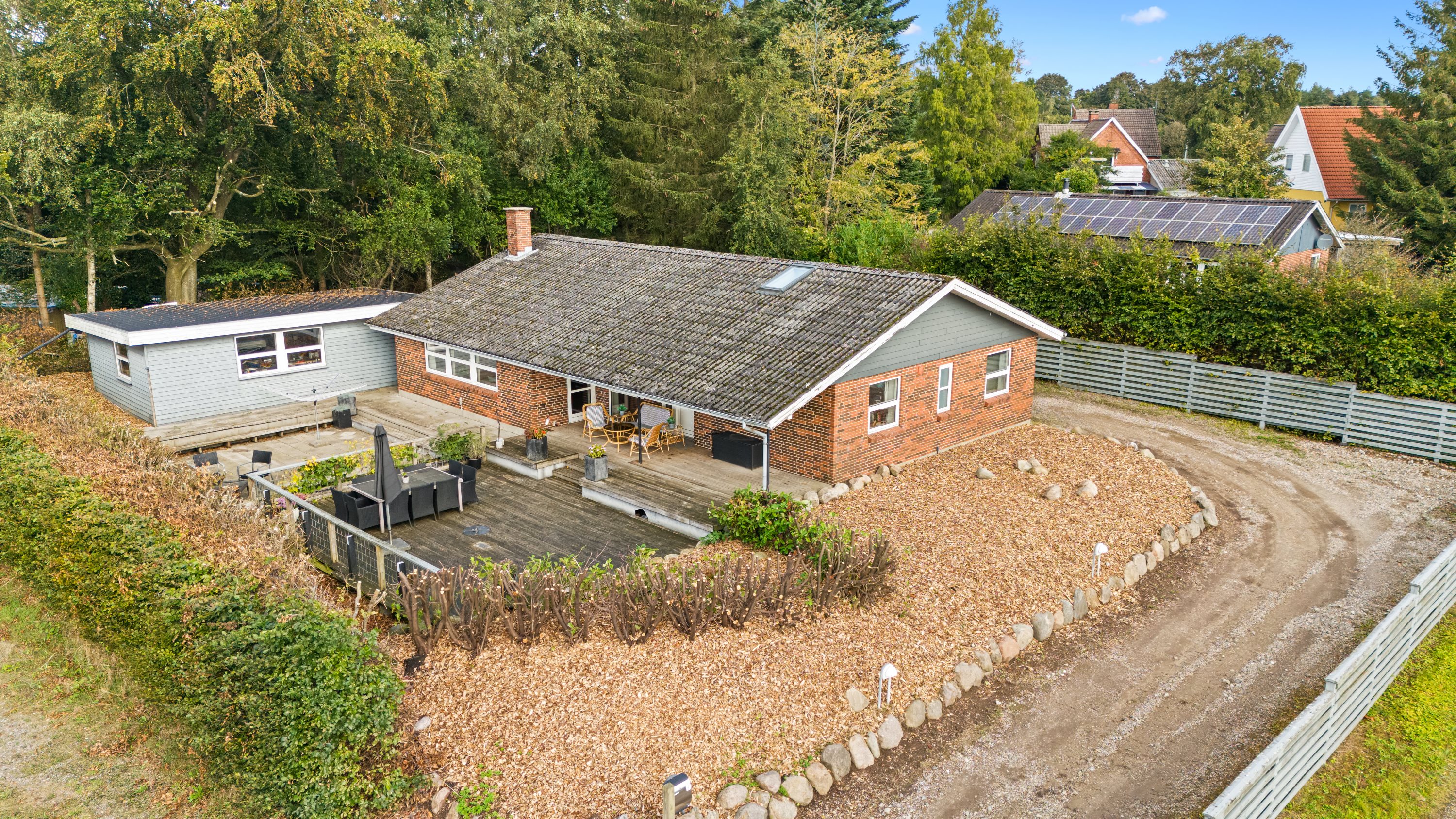 Villaen har en god placering på grunden, der giver rig mulighed for at man ugeneret kan nyde solen hele dagen og særligt det store sydvestvendte terrasseanlæg er et stort aktiv for ejendommen.