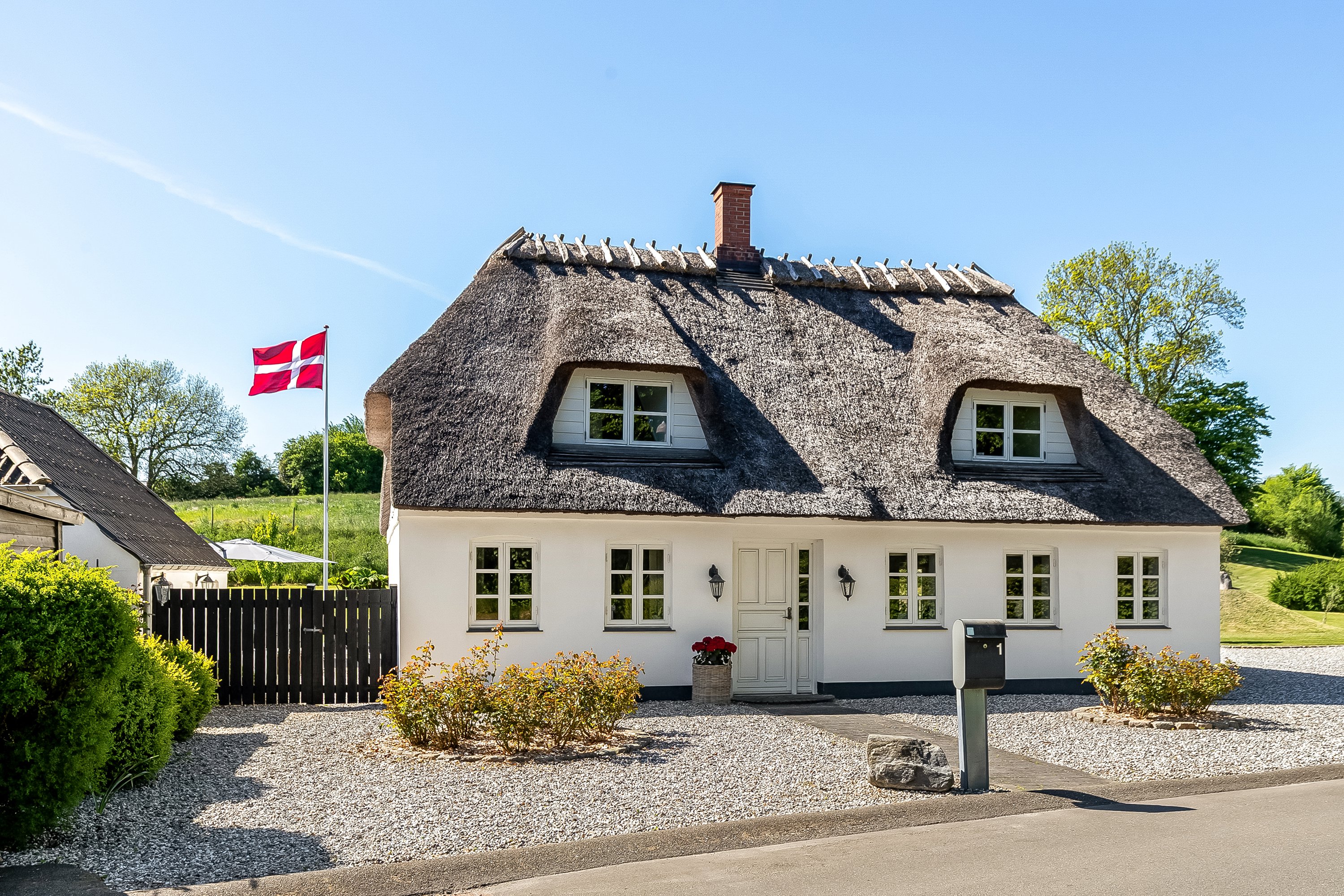 Den hvide facade og stråtaget danner rammen om et klassisk hus med moderne opdateringer.