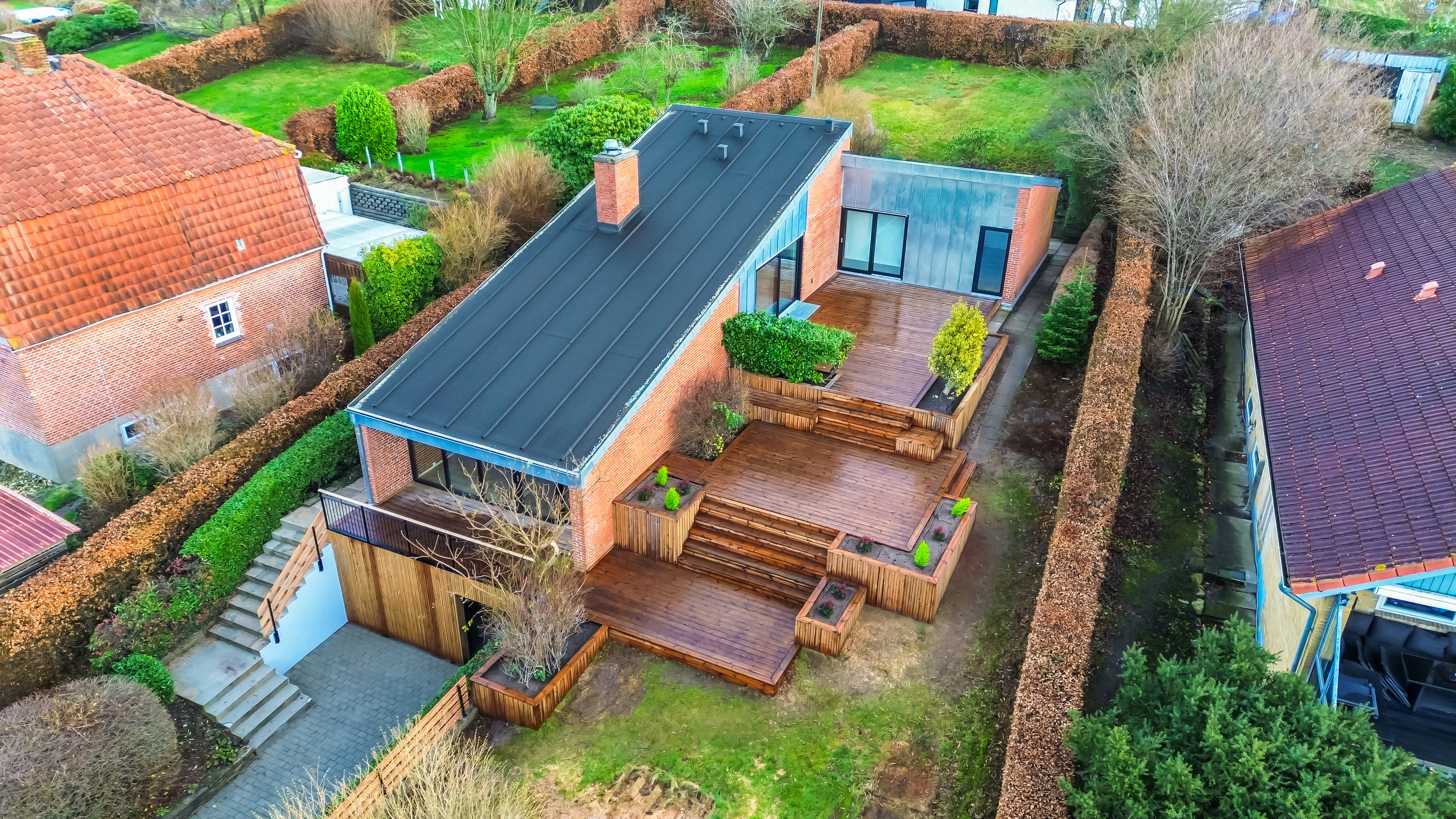 Villaen står i dag som en kompromisløs kombination af klassiske materialer og moderne æstetik. Dekarakteristiske murstensvægge, de skarpe linjer og det markante tagspil skaber et arkitektoniskstatement, mens de nye løsninger tilfører huset en lethed og funktionalitet, der matcher nutidens forventninger. Indenfor mødes du af en imponerende loftshøjde, smukke sildebensgulve og et åbent køkken-alrum med elegante materialer og integrerede detaljer, som fremhæver husets originale geometri. Lysindfaldet og de forskudte niveauer skaber en atmosfære, der både er dramatisk og harmonisk – et hjem, der føles som et kunstværk at opholde sig i.