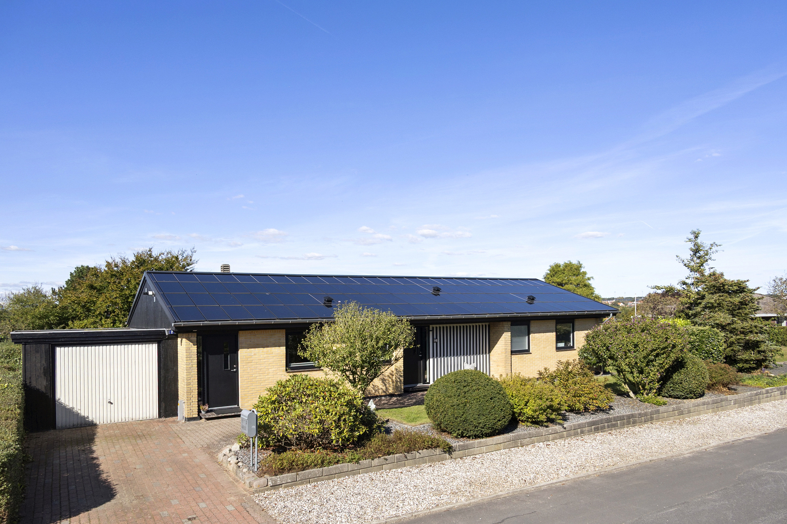 Den gule murstensfacade kombineret med sorte trædetaljer giver et klassisk, indbydende udtryk, mens solcellerne på taget bidrager til økonomiske og miljøvenlige fordele.
