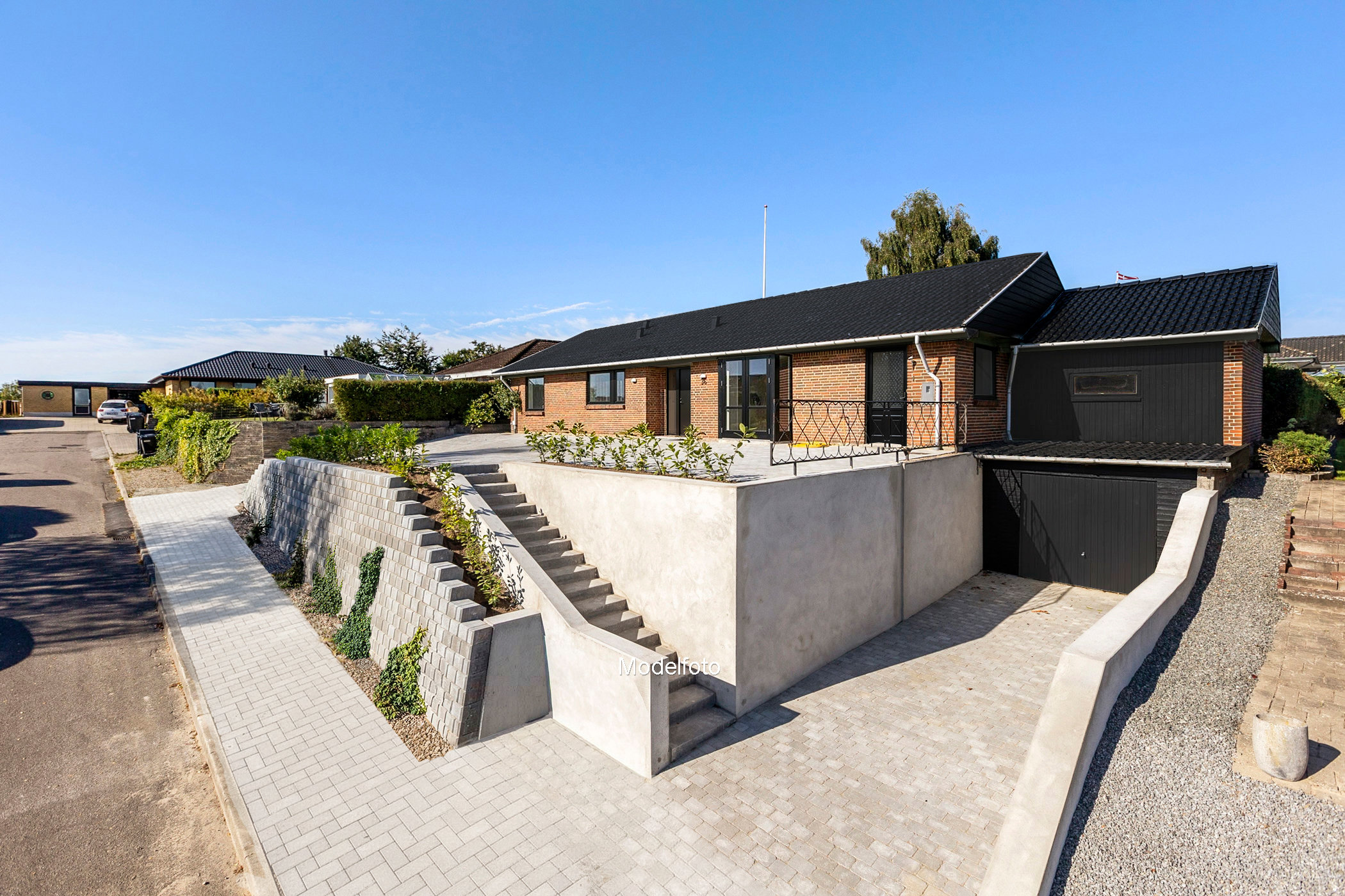 Flisebelægningen udenfor er fra 2025, og den er anlagt smart med trapper og rampe, så I kan køre op til huset med både bil og barnevogn. På det store fliseareal på husets forside kan I lade børnene lege frit og bare nyde solen, der rammer allerede fra om morgenen. På den anden side af huset kan I nyde aftensolen på det delvist overdækkede terrassemiljø, som er fint omkranset af læmure, mens børnene kan boltre sig i haven, der er anlagt med gode græsarealer, en stor hængebirk, en fin sommerfuglebusk og et drivhus til alverdens gode grønne sager.
