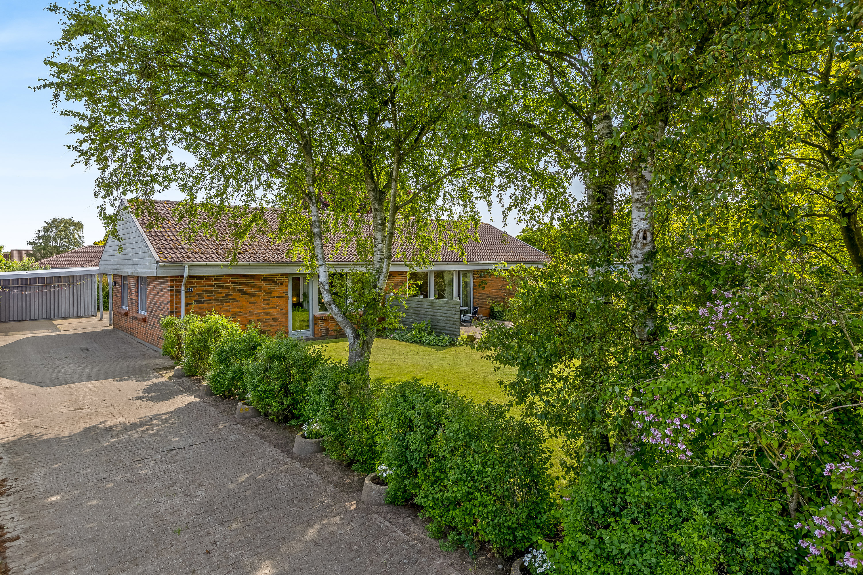 Udendørs venter en dejlig lukket have, hvor der er plads til leg og afslapning, samt en træcarport, der giver beskyttet parkering til bilen.