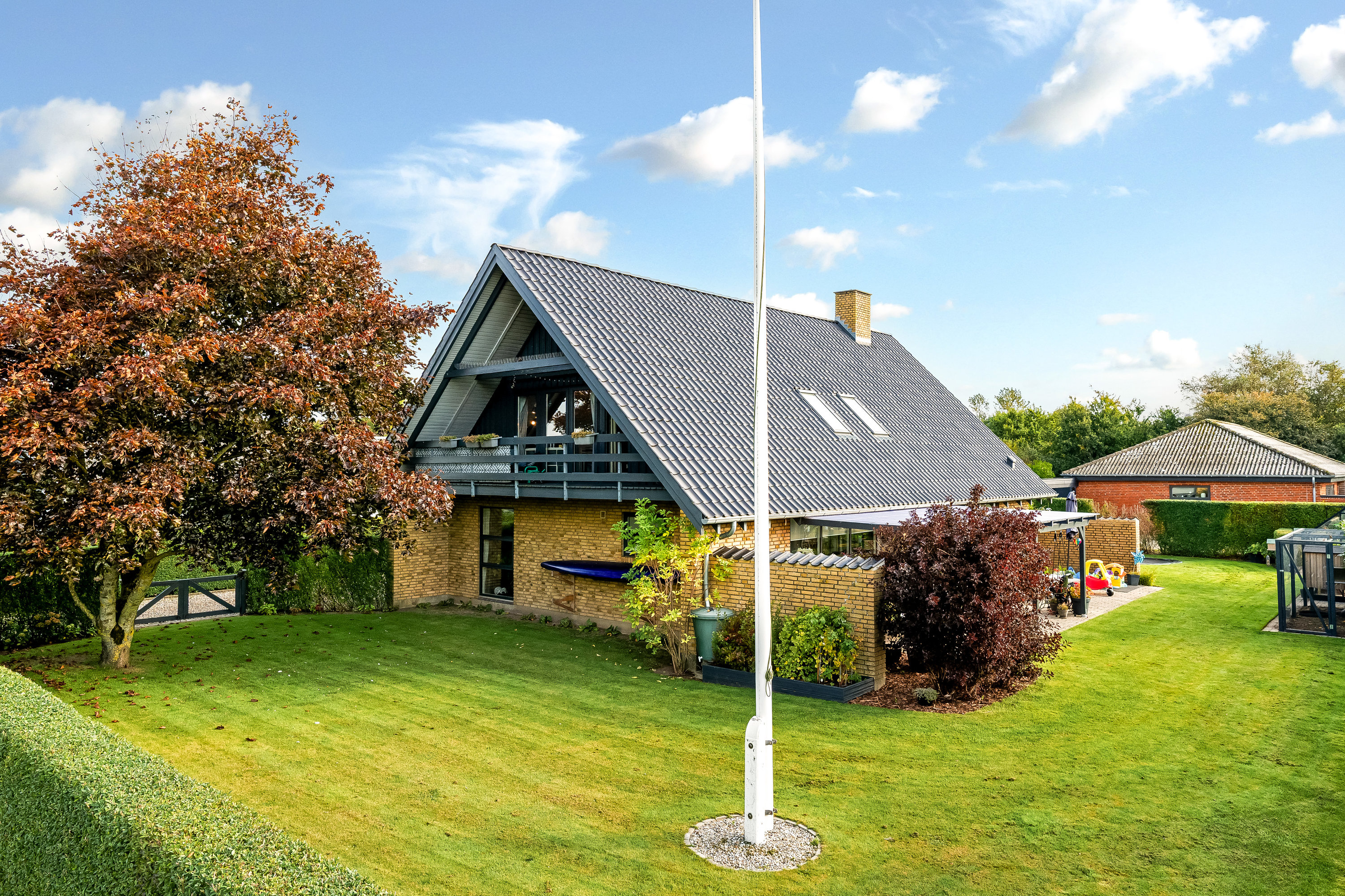 Huset præsenterer sig flot med gule sten og et sort tegltag fra 2014, der giver ejendommen et tidløst og solidt udtryk.