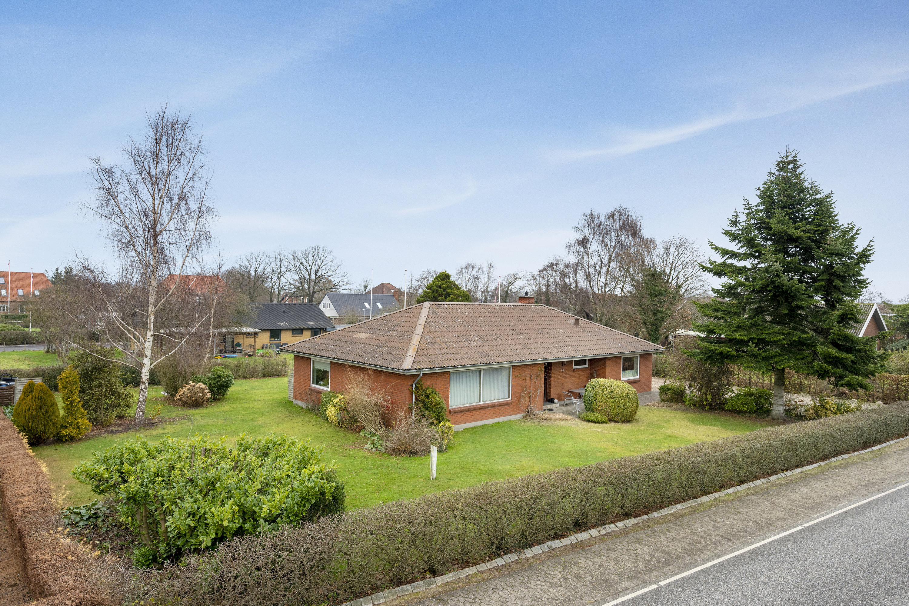 Ejendommen fremstår i røde teglsten med tag af bølgeeternit og trævinduer – klassisk for området og tidsperioden. Opvarmning sker via naturgas.