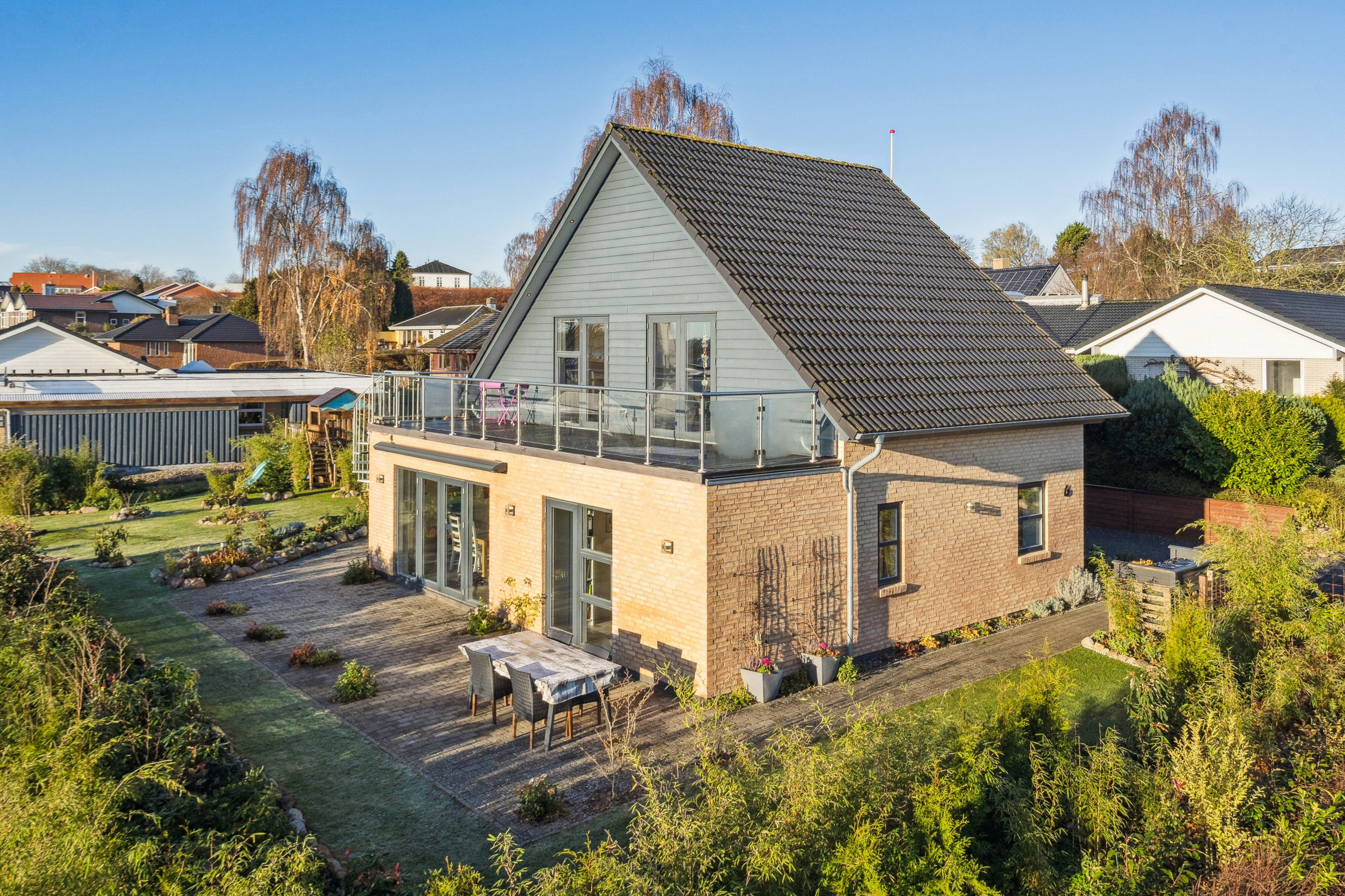 På førstesalen fortsætter den gode stemning med en dejlig stue, hvorfra der er udgang til en stor og solrig tagterrasse – et skønt uderum, som forlænger sommerhalvåret og giver jer et oplagt sted at nyde udsigten og de rolige omgivelser. Etagen rummer desuden endnu et værelse samt husets andet badeværelse, som både har bruseniche og et elegant fritstående badekar. Fra tagterrassen fører en trappe direkte ned til haven, som er både let at holde og samtidig utrolig hyggelig. I haven finder I blandt andet et drivhus, der også fungerer som vinterhave og dermed giver mulighed for at nyde udelivet tidligere om foråret og senere på efteråret.
