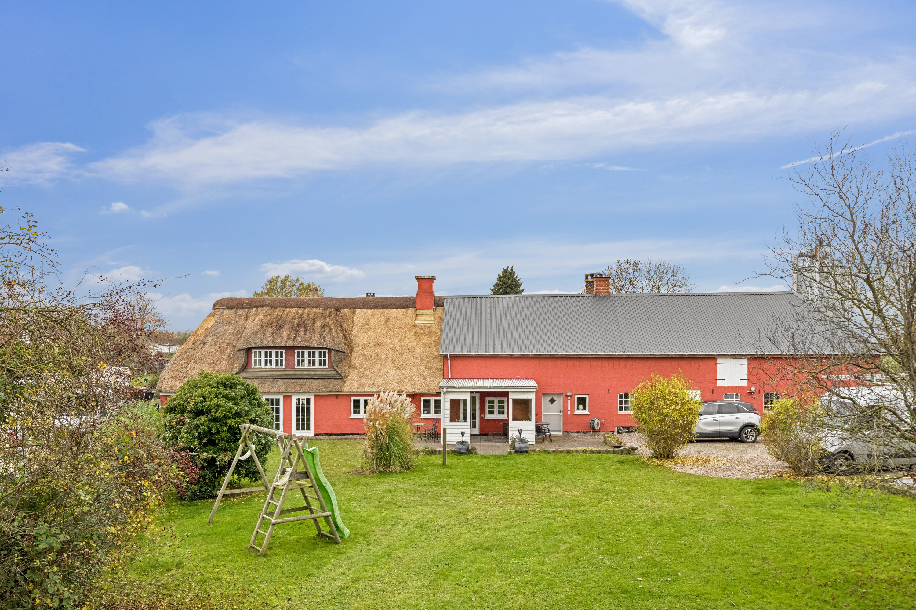 Ejendommen har pudsede og malede murstensfacader og en kombination af strå- og stål som tagbelægning. Grunden er anlagt med en gårdsplads samt et stort græsareal. Der er også en god terrasse, hvoraf en del er overdækket. Grunden grænser op til åbne marker og udsigten over disse mod skoven er ikke så ringe endda!