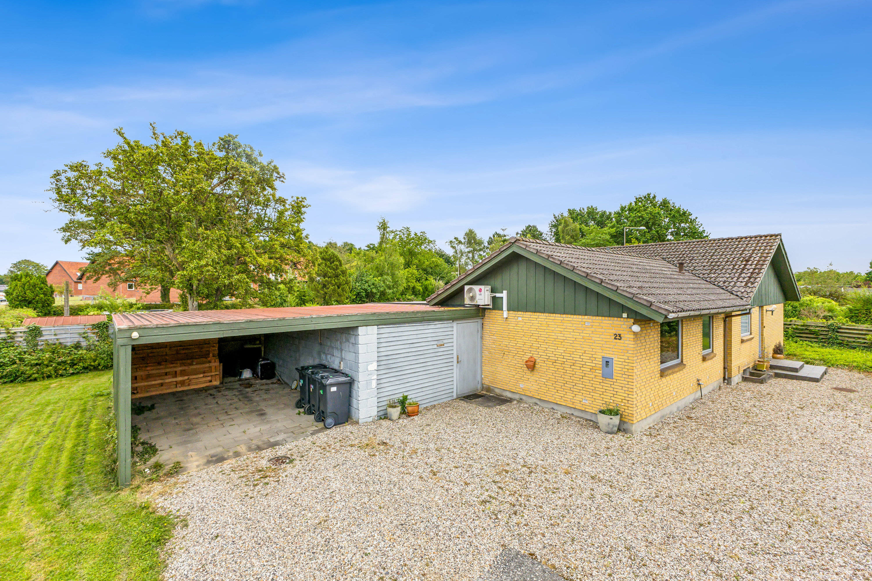 Udenfor præsenterer haven sig med en stor dobbelt grund, her kan børnene lege, mens du nyder de lange sommeraftener på den overdækkede terrasse.