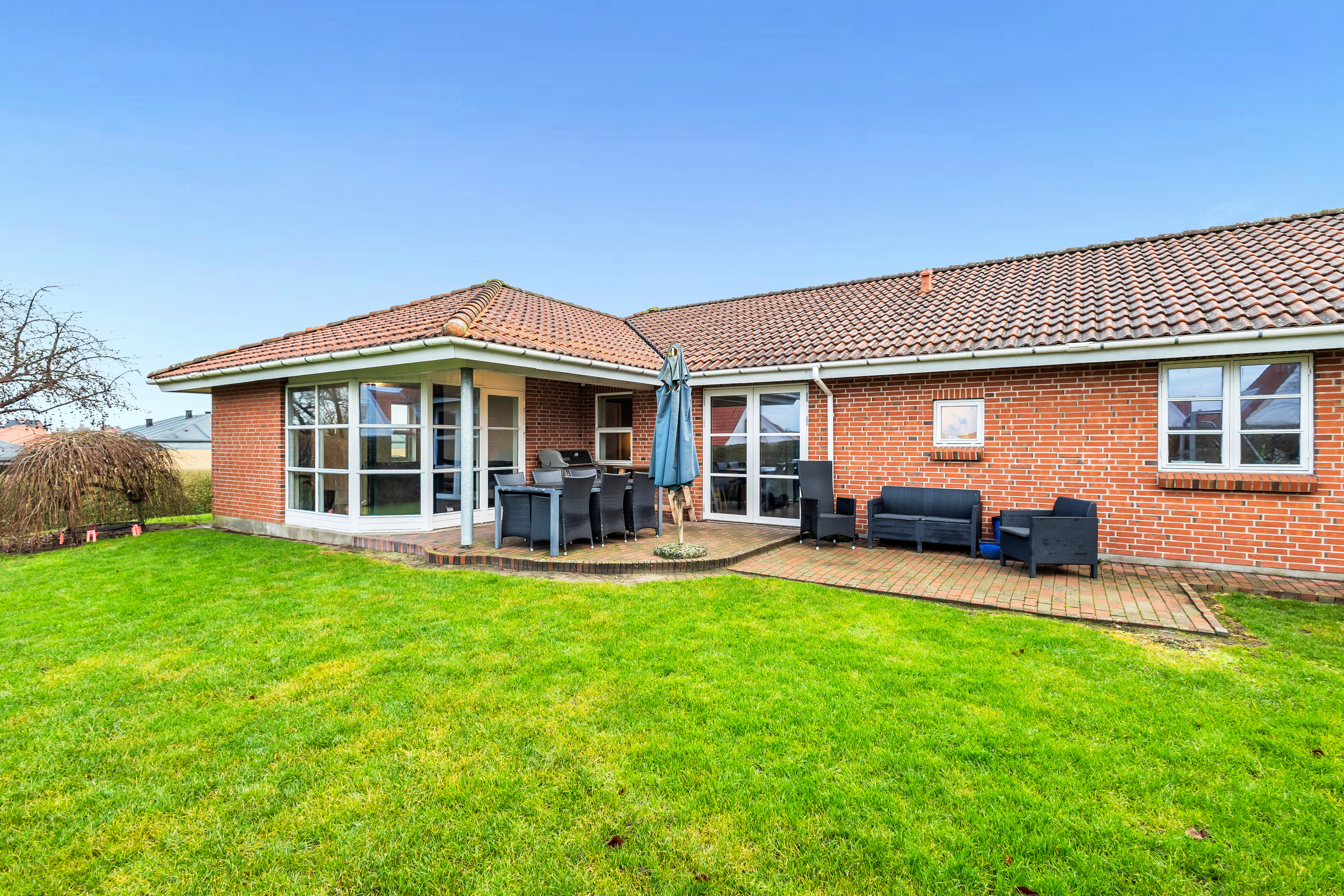 Villaen præsenterer sig med et velanlagt og overskueligt udeareal, hvor haven er holdt enkel og nem atpasse, og hvor den store terrasse – delvist overdækket – danner en naturlig forlængelse af boligens opholdsrum. Her er rig mulighed for både afslapning og fælles måltider udendørs, og et praktisk redskabsrum giver plads til opbevaring og hobbyprojekter.
