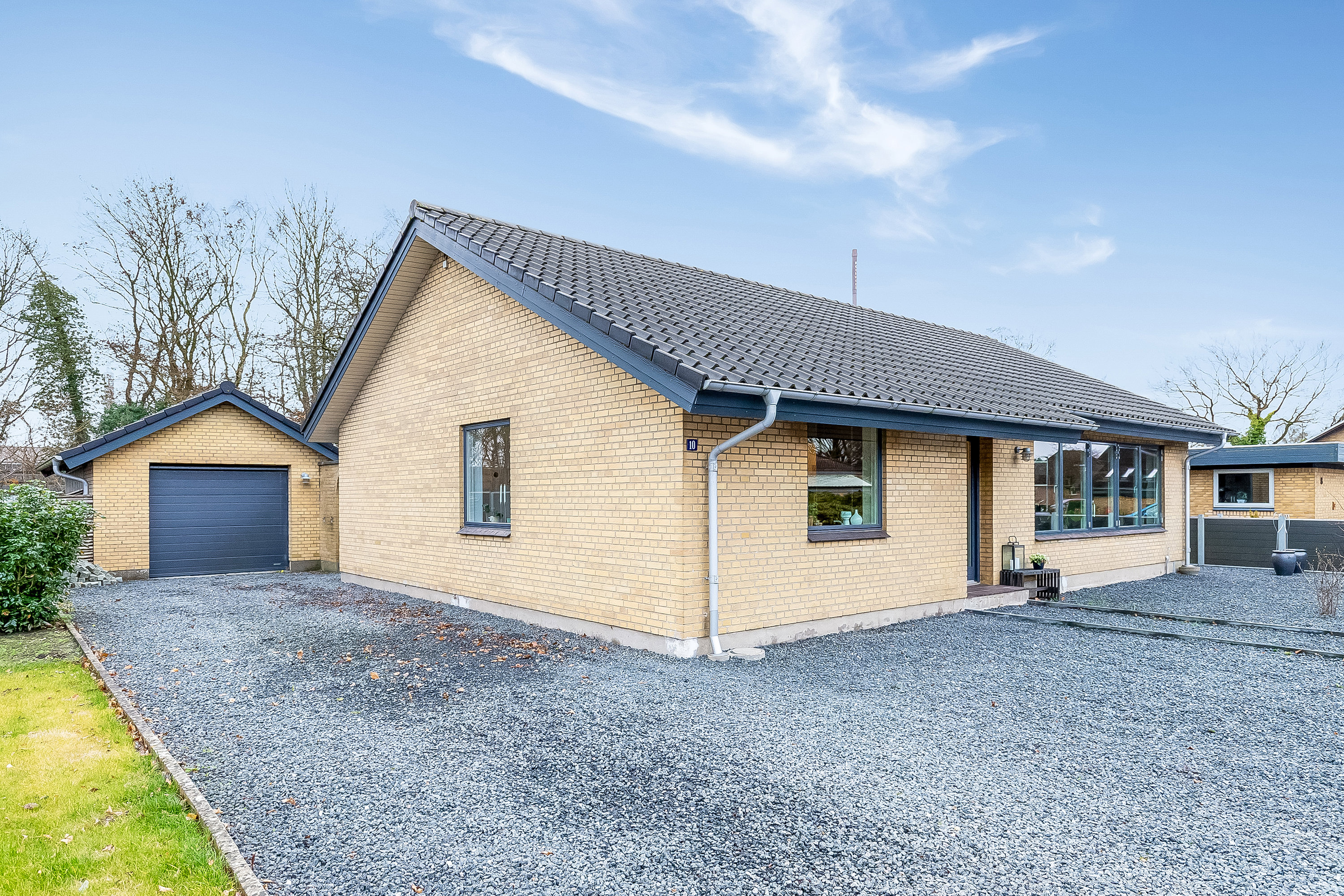 Haven er et skønt uderum for store og små. Her får I en sydvestvendt terrasse, der er delvist overdækket, og derfor kan bruges i al slags sommervejr. Plænen sørger for plads til boldspil og leg, mens I kan opbevare havemøbler og -redskaber i skuret. Foran huset er der både garage og ekstra parkeringsmuligheder i indkørslen – flot anlagt med granitskærver. Taget er fra ca. 2012, mens vinduerne er fra ca. 2008.