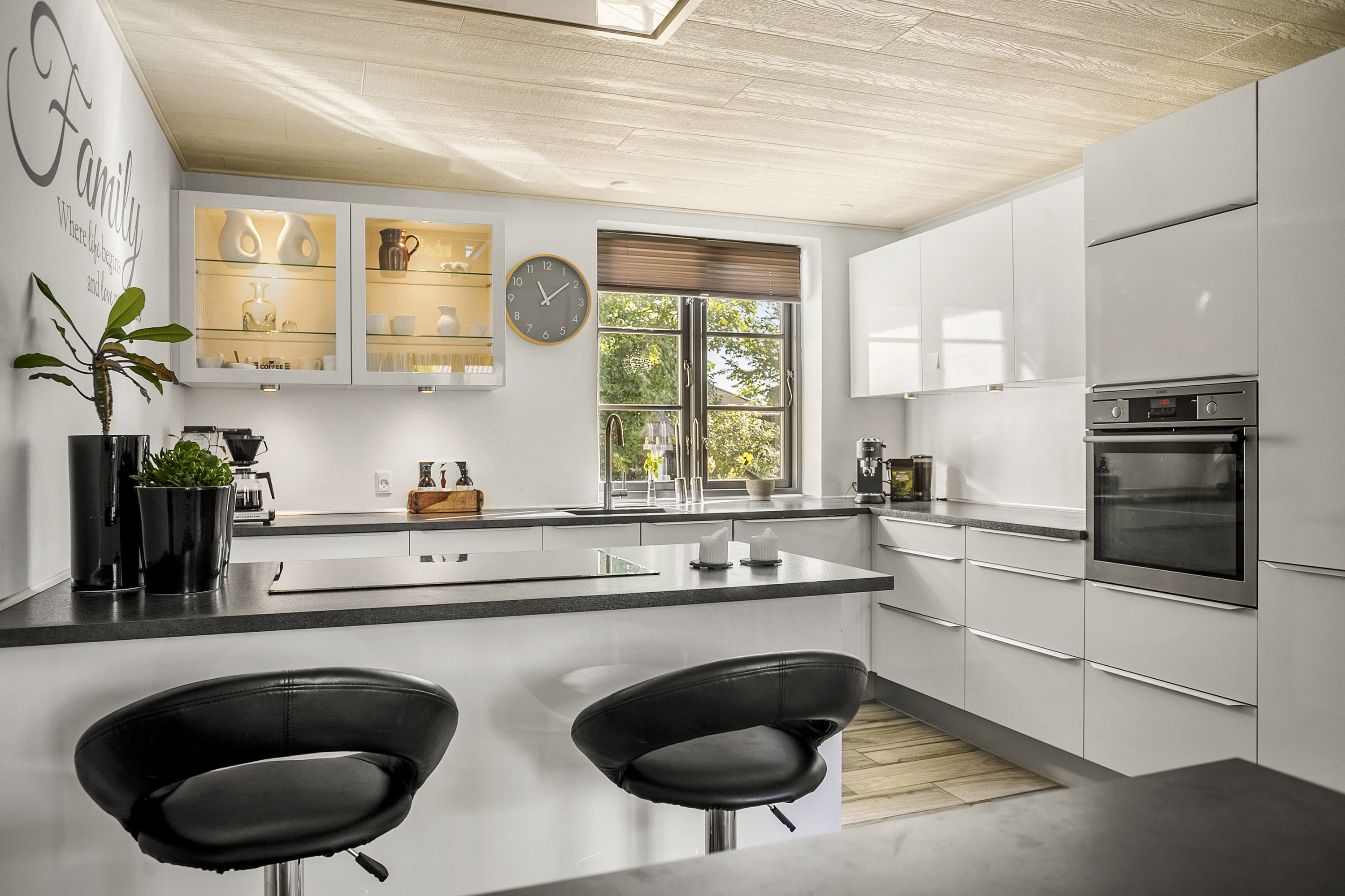 Husets hjerte er det store køkken-alrum, som ligger i åben forbindelse med opholdsstuen. Her skaber brændeovnen en hyggelig atmosfære, og der er direkte udgang til terrassen, hvor solens timer kan nydes i private rammer.