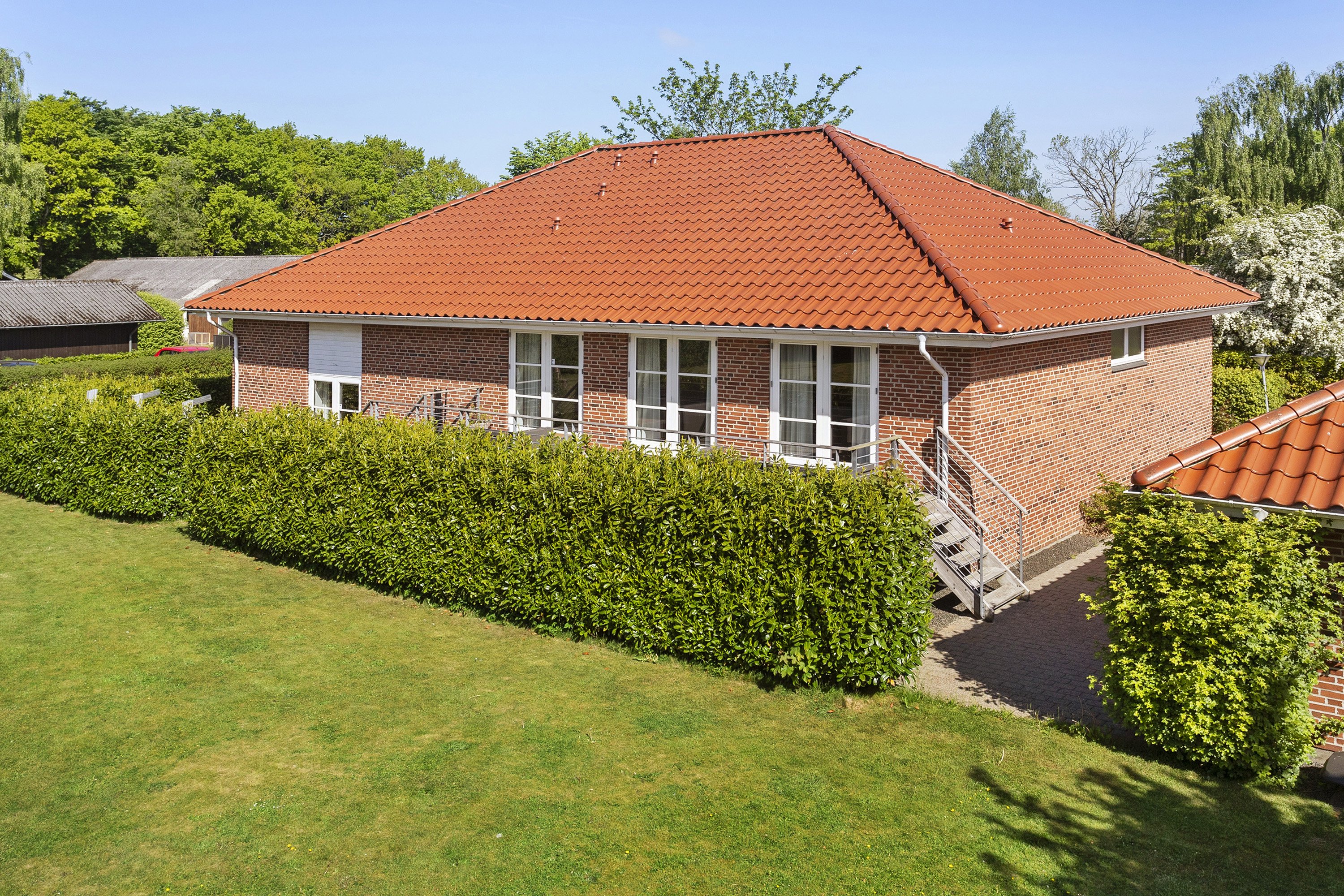 Ved siden af ligger bryggerset, og i den anden del af det forhøjede stueplan er der to vidunderligt store børneværelser, et toilet og et aldeles skønt opholdsrum med køkken og stue i åbent forløb. Herfra har I tre dobbeltdøre ud til den sydvendte terrasse, så ude og inde hænger perfekt sammen.