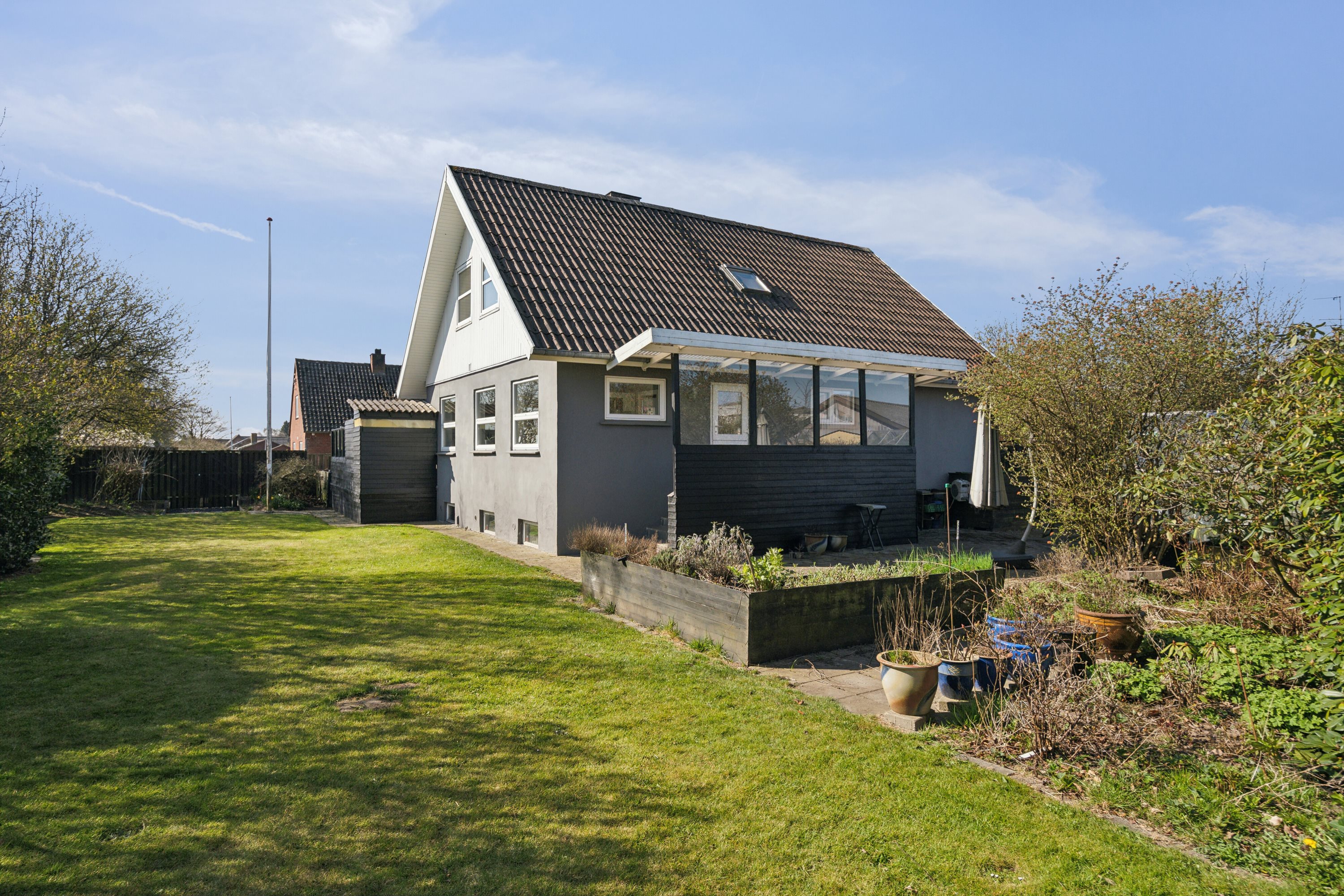 Den lyse stue har store vinduer, der lader lyset skabe en hyggelig atmosfære, perfekt til afslapning og samvær. Køkken/alrummet er et midtpunkt med sit flotte udseende, der inspirerer til madlavning og hyggelige middage. Der er masser af plads til at samle venner og familie, mens de brede glaspartier åbner op mod den solrige terrasse og haven – et ideelt sted til morgenkaffen eller en grillmiddag. Derudover finder du et stort soveværelse og et badeværelse. 1 sal rummer 3 store værelser og et badeværelse, som gør at 1 salen fremstår yderst funktionel. I kælderen er der yderligere plads til kreativ indretning med flere disponible rum, som kan tilpasses efter behov – måske som hobbyrum, kontor eller ekstra opbevaringsplads. Den velholdte have er en oase af privatliv og ro, hvor børnene kan lege frit, og de voksne kan nyde de lune sommeraftener. Den nemme adgang til terrassen gør det let at flytte udendørslivet ud, samt er der mulighed for hyggelige aftener ved den lukkede terrasse. Trænger du til et bad, så kan du nemt tage det i udendørsbruseren.