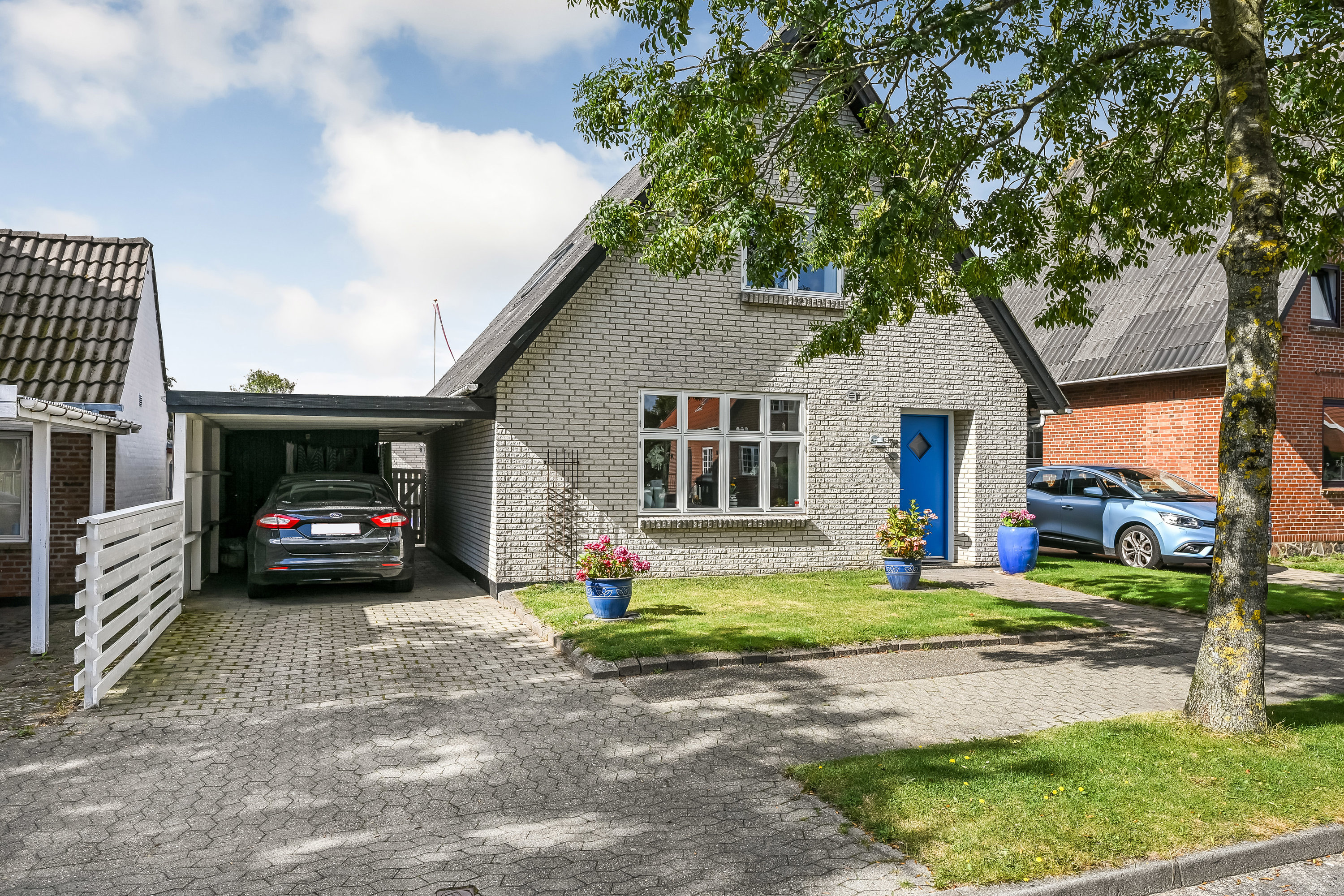 Den lidt tilbagetrukne beplantning og carporten ved indkørslen giver praktisk adgang og samtidig privatliv.