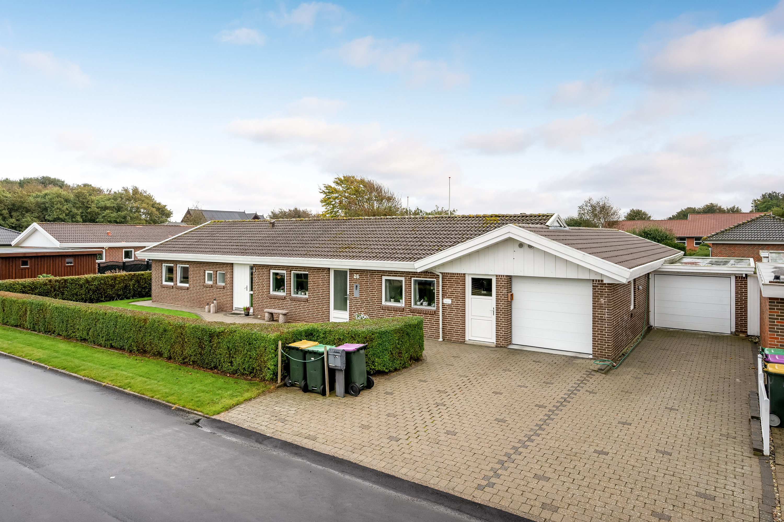 Huset har flere praktiske fordele, der gør hverdagen lettere: bryggers med udgang til haven, integreret garage samt et større værksted/hobbyrum med egen adgang — ideelt til gør-det-selv-projekter, teenagerum eller som ekstra opbevaringsplads. Den nordvendte facade giver ro i de private rum, mens terrassen og flisearealerne mod sydvest inviterer til morgenkaffe og aftenssamvær.