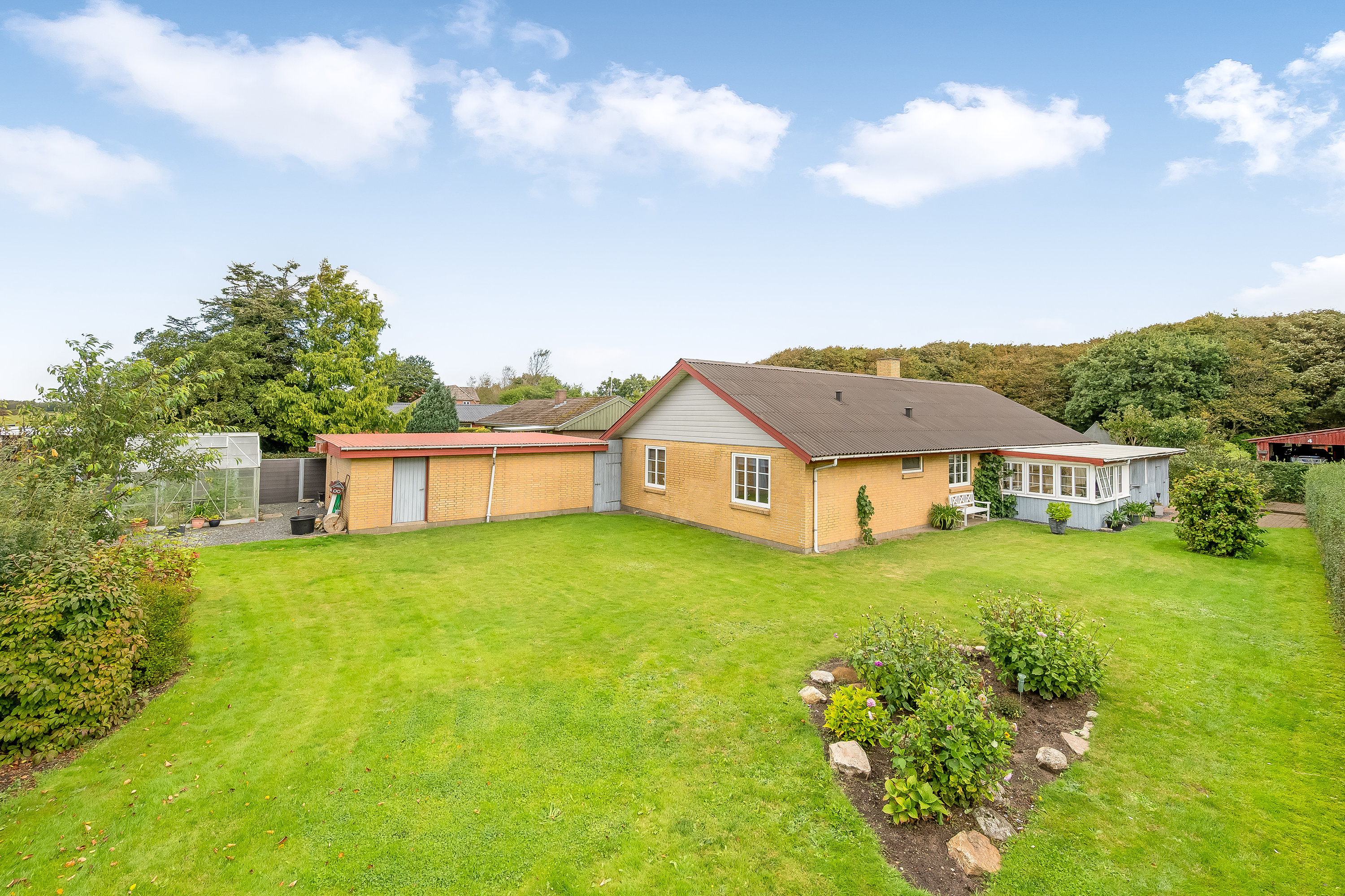 Ejendommen suppleres af en garage med elport, et brændeskur og et drivhus, som giver gode muligheder for både hobby og opbevaring.