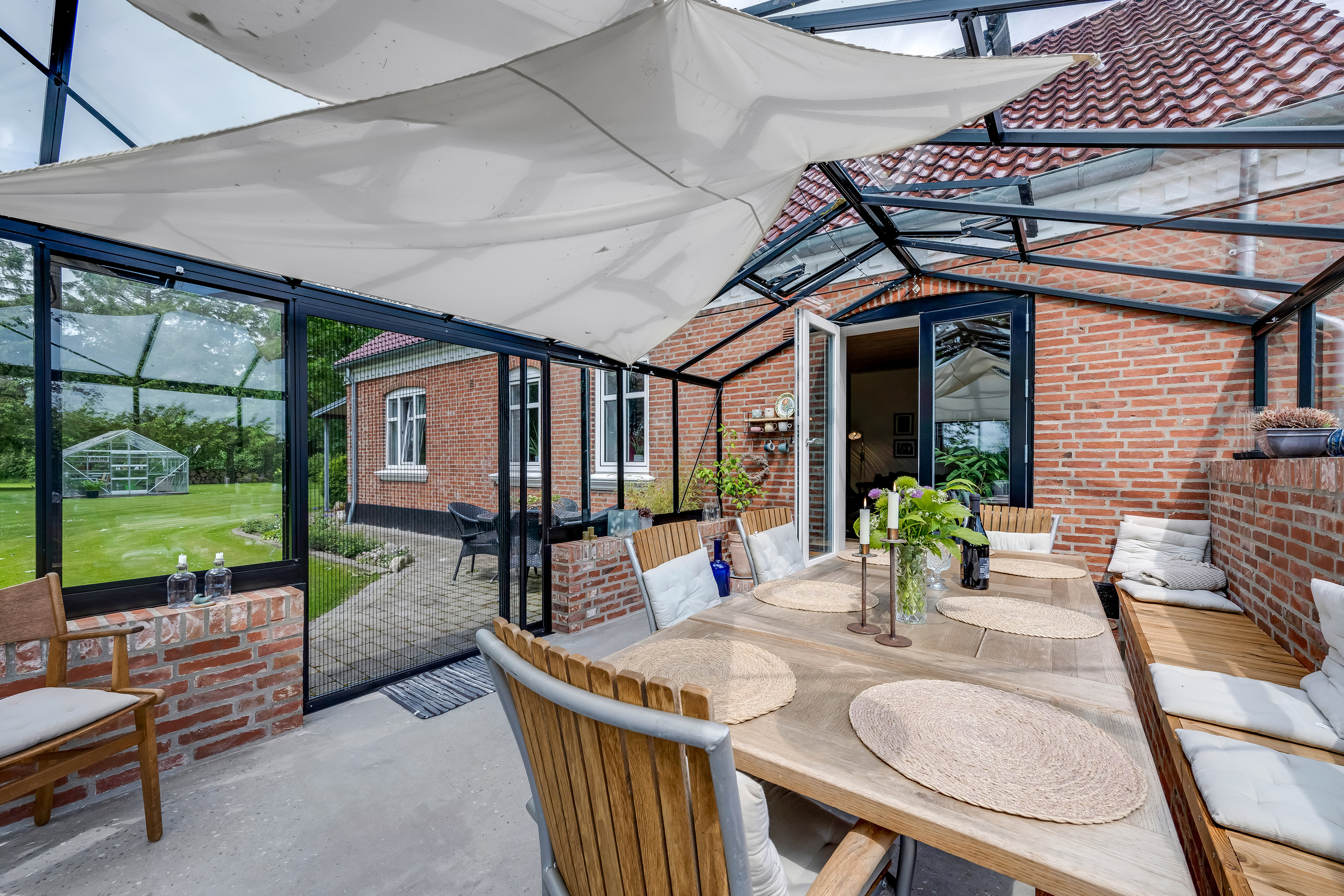 Haven er et kapitel for sig – en lille, parklignende oase med smukke gamle træer, stauder og frodige buske. Her findes flere hyggelige opholdskroge og overdækkede terrasser, som gør det muligt at nyde udelivet uanset vejr og årstid.