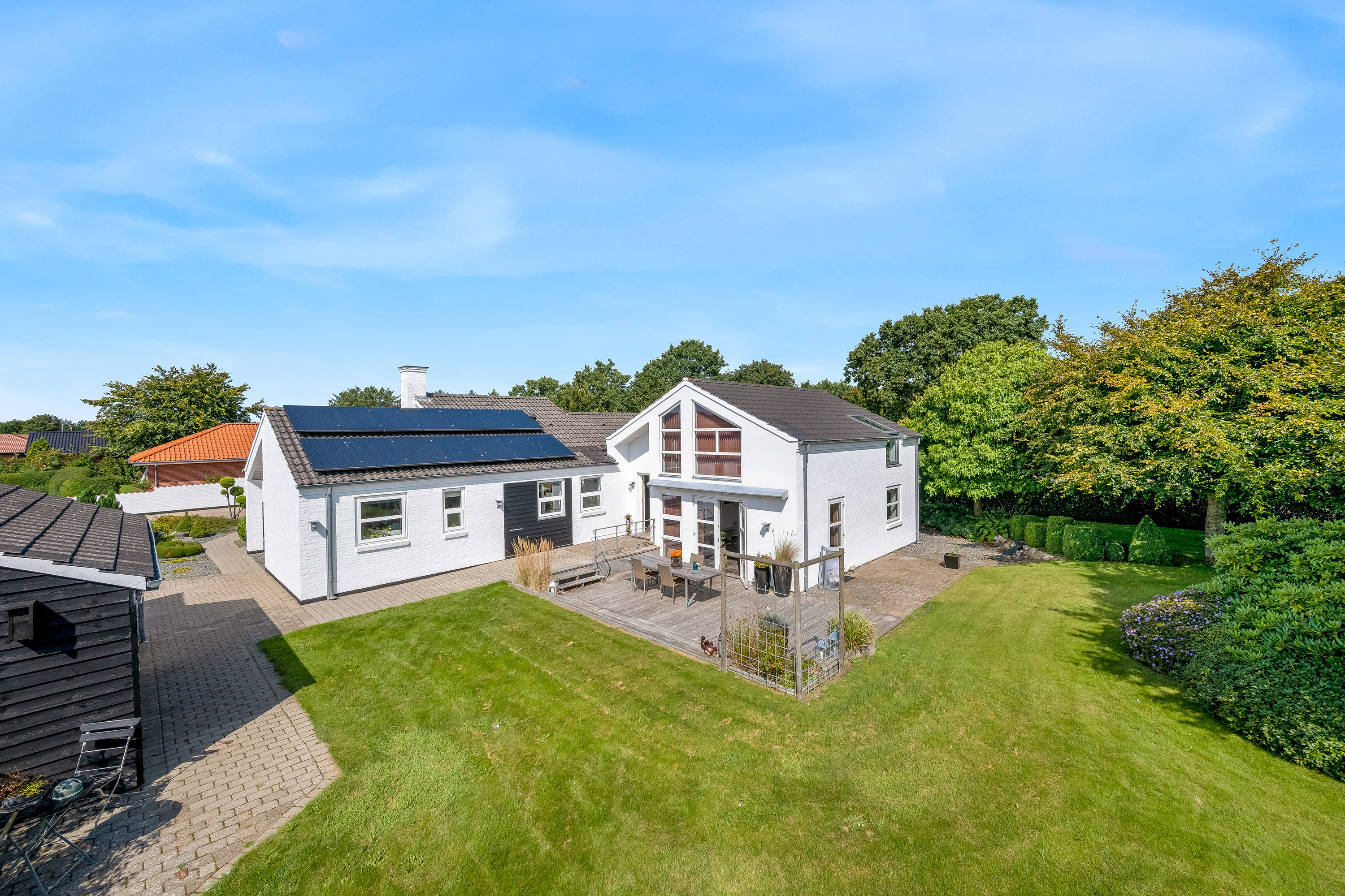Udenfor finder du en fantastisk, ugeneret have med solrige terrasser, hyggelige lækroge og masser af plads til leg og udeliv. Til ejendommen hører desuden en muret garage på hele 54 kvm i samme stil som huset samt en carport fra 2006 på 36 kvm. Endvidere er der oplagt solceller.