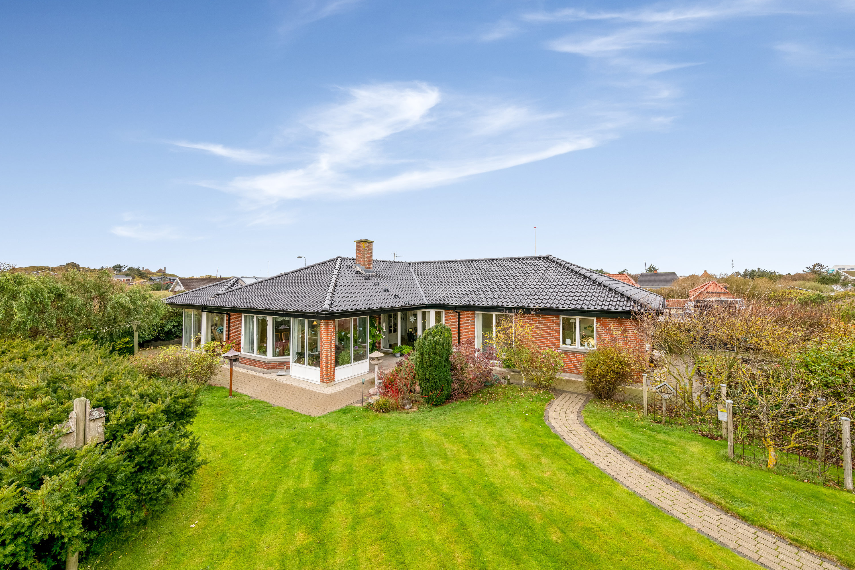 På Nordsøvej 73 i Søndervig finder du en særdeles velbygget villa på 210 m² – en sjældenhed i et område, hvor de fleste ejendomme er sommerhuse. Her får du en solid helårsbolig med plads til både familie og gæster, opført i materialer af høj kvalitet og med fokus på funktionalitet og komfort.
