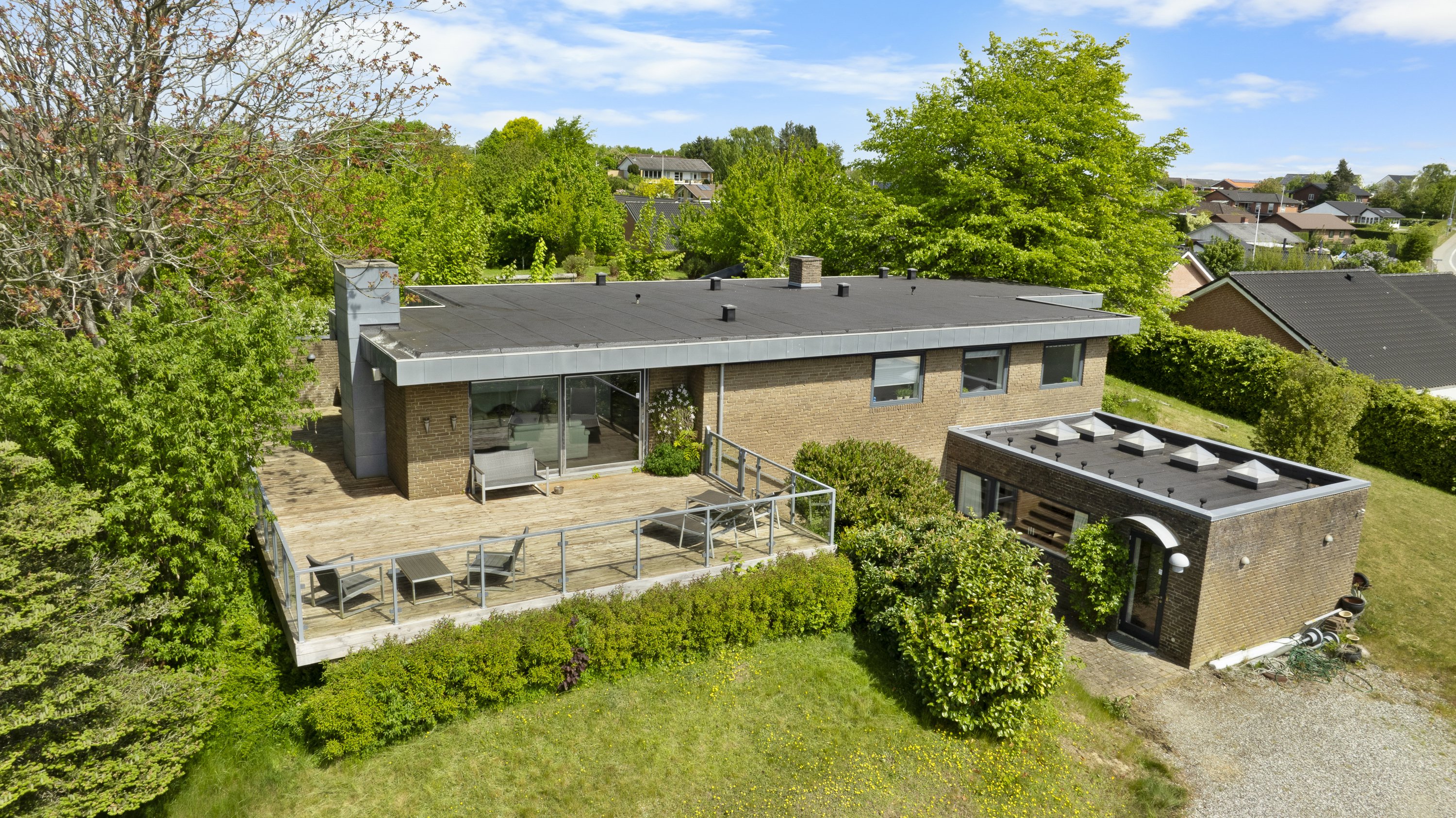 På husets øverste plan er det lyset, der dominerer udtrykket. Her venter fire gedigne værelser, praktisk bryggers med egen indgang, rummeligt badeværelse og store, lækre fællesrum, hvorfra en skøn udsigt over området kan nydes. Her ligger køkken, alrum og stue i åben forbindelse med hinanden og giver videre adgang til et kæmpestort terrassemiljø, der er etableret mod syd og, som i sommerhalvåret, når terrassedørene står åbne, fungerer som naturlige forlængelser af de store fællesrum. Terrassen ligger perfekt orienteret mod syd/sydvest og har altså sol gennem det meste af dagen.
