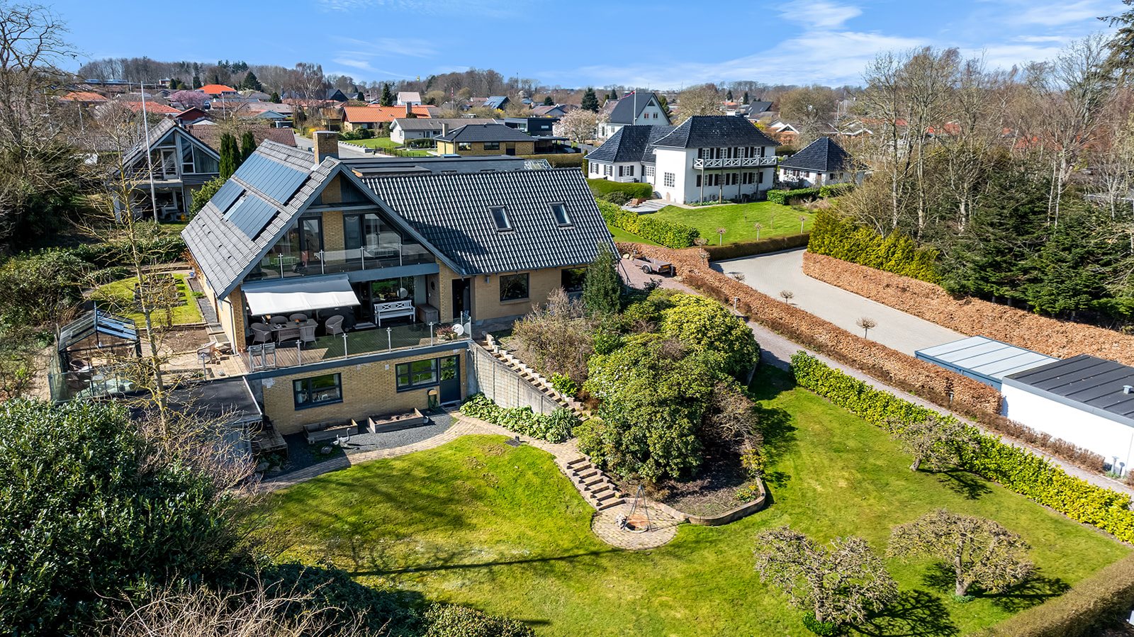 Ligeledes betagende er husets udemiljø, som er anlagt i flere niveauer. Ved siden af terrassen foran stuen er der et orangeri, hvor I kan nyde morgenkaffen i lune omgivelser. Der er desuden flisegang rundt om huset med terrasser flere steder. Haven er nydeligt anlagt og lægger en smuk ramme om ejendommen.