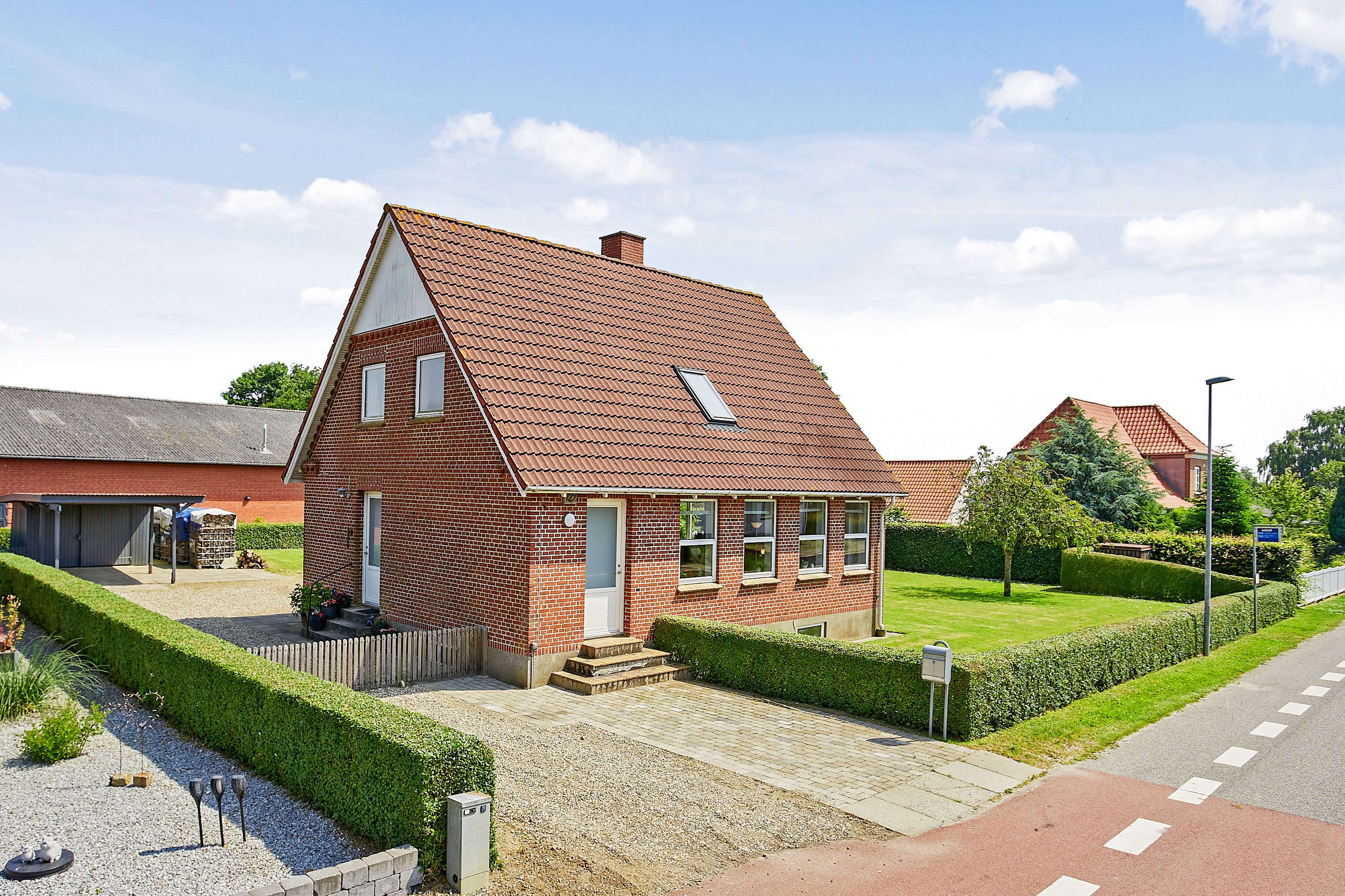 Huset: Rødt murstenshus i 3 plan fra 1933 med tilhørende carport. Stor have primært udlagt i græs. Her er god plads til leg, spil og hygge samt dejlig og uforstyrret terrasse. Huset ligger i cykelafstand til skole og børnehave.