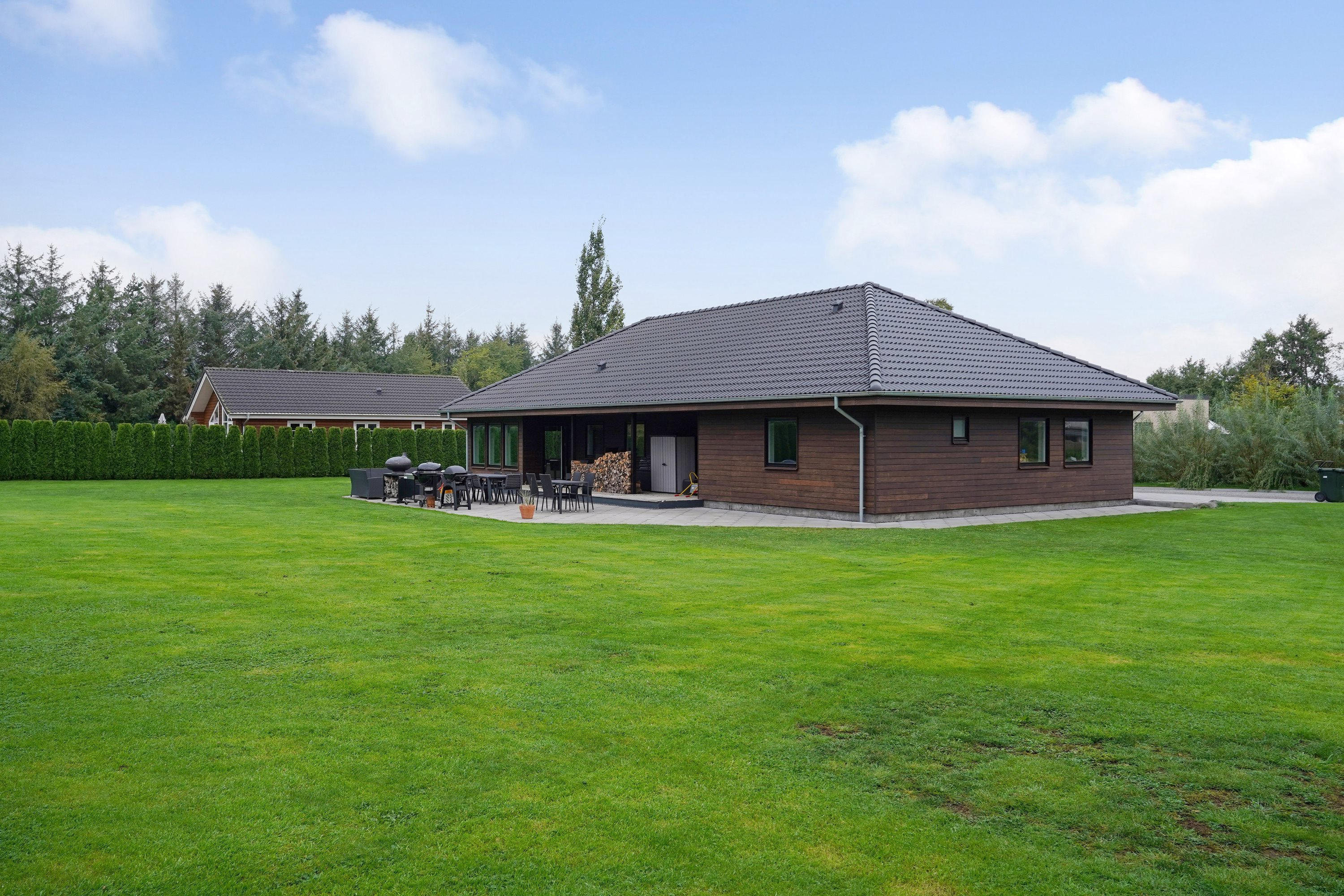 Den store sydvendte grund byder på et fantastisk stort græsareal, hvor du vil opleve solen hele dagen. Her er der ført fliser hele vejen rundt omkring boligen og i indkørslen. På den sydlige side af boligen, findes et overdækket terrassemiljø, hvor et dejligt kig til haven kan nydes.