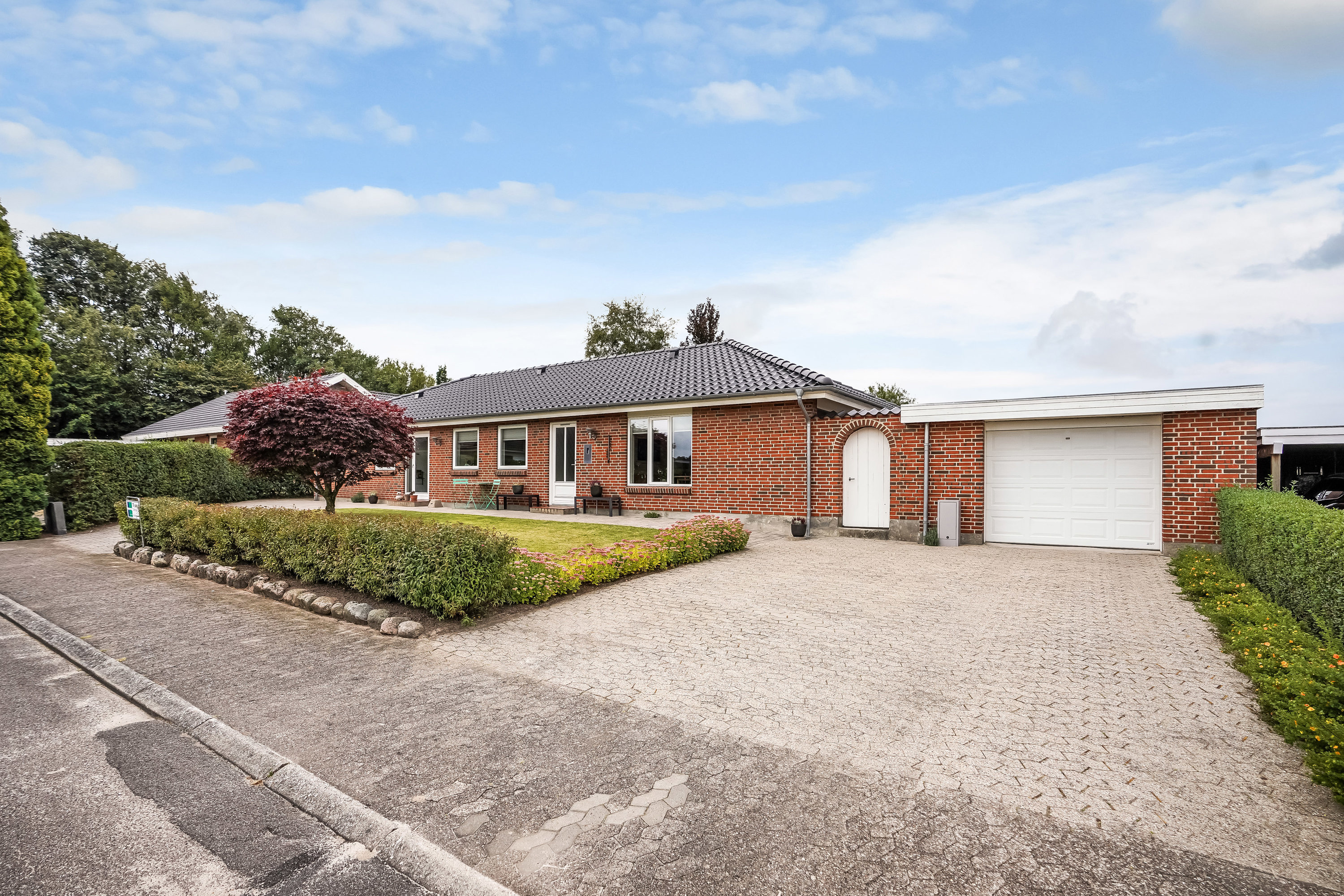 Foruden huset, får du en god muret garage med el-port på 36m2 og skønne terrassemiljøer, om end du er til morgen- eller aftensol.