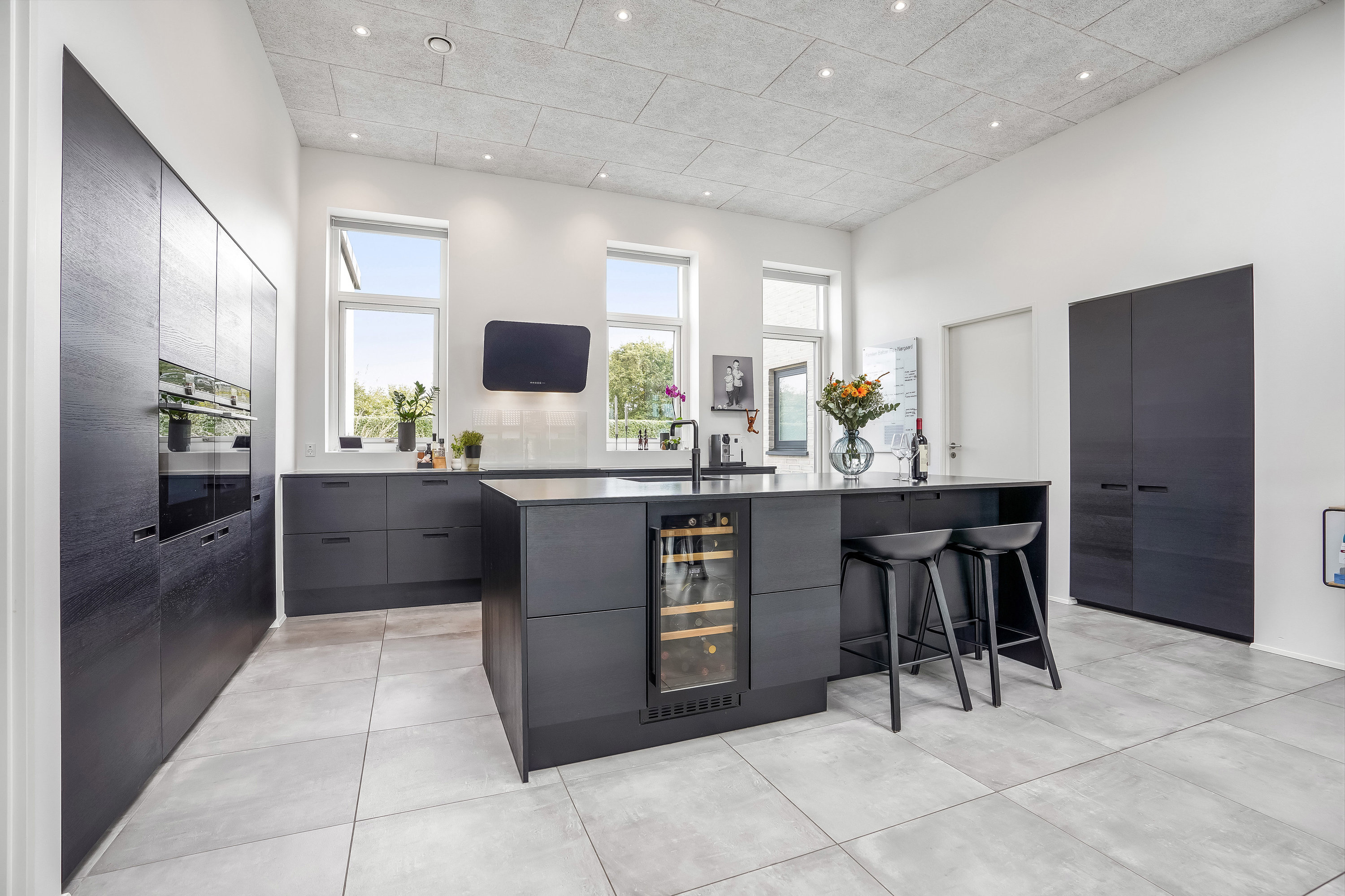 Fra det øjeblik du træder ind, mærkes den gennemtænkte planløsning og de arkitektoniske detaljer, som gør denne bolig helt særlig. De lyse materialer, de store vinduespartier og det elegante samspil mellem murværk, træ og glas skaber et roligt og eksklusivt udtryk, hvor dagslyset strømmer frit gennem rummene. Husets hjerte er det åbne køkken-alrum, hvor design, kvalitet og funktionalitet går hånd i hånd. Her er skabt et naturligt samlingspunkt for familien – med plads til både madlavning, hverdagsliv og hyggelige stunder omkring spisebordet. Opholdsstuen ligger i forlængelse af alrummet og byder på store vinduespartier, der åbner mod haven og den overdækkede terrasse, samt en stilren, gennemgående pejs, der elegant forbinder rummene.