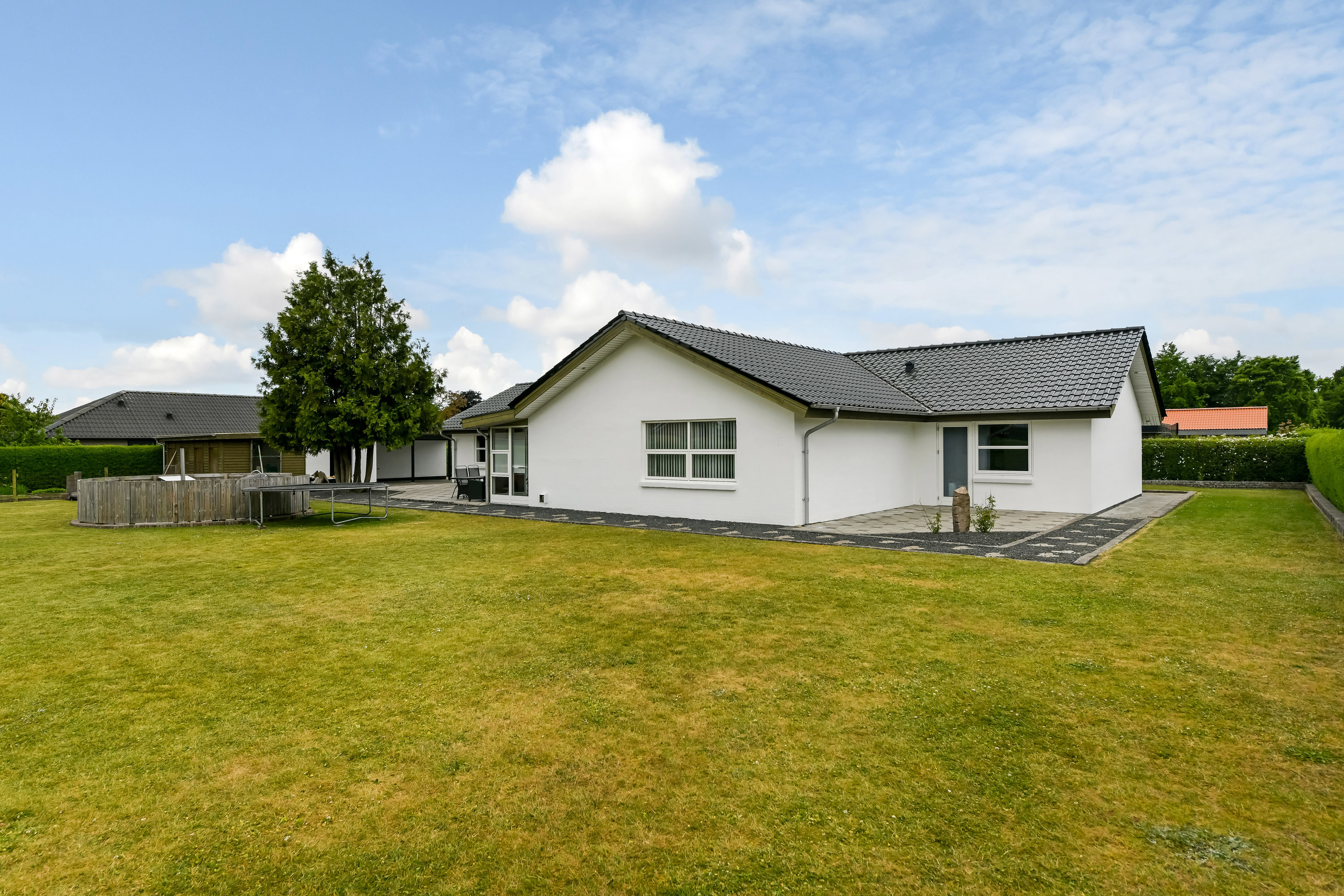 Ejendommen fremstår med et klassisk, hvidpudset udtryk og mørkt tag, og facaden kræver minimal vedligeholdelse. Indkørslen er rummelig og flot anlagt med stenbelægning, og her er god plads til både gæsteparkering og daglig brug.