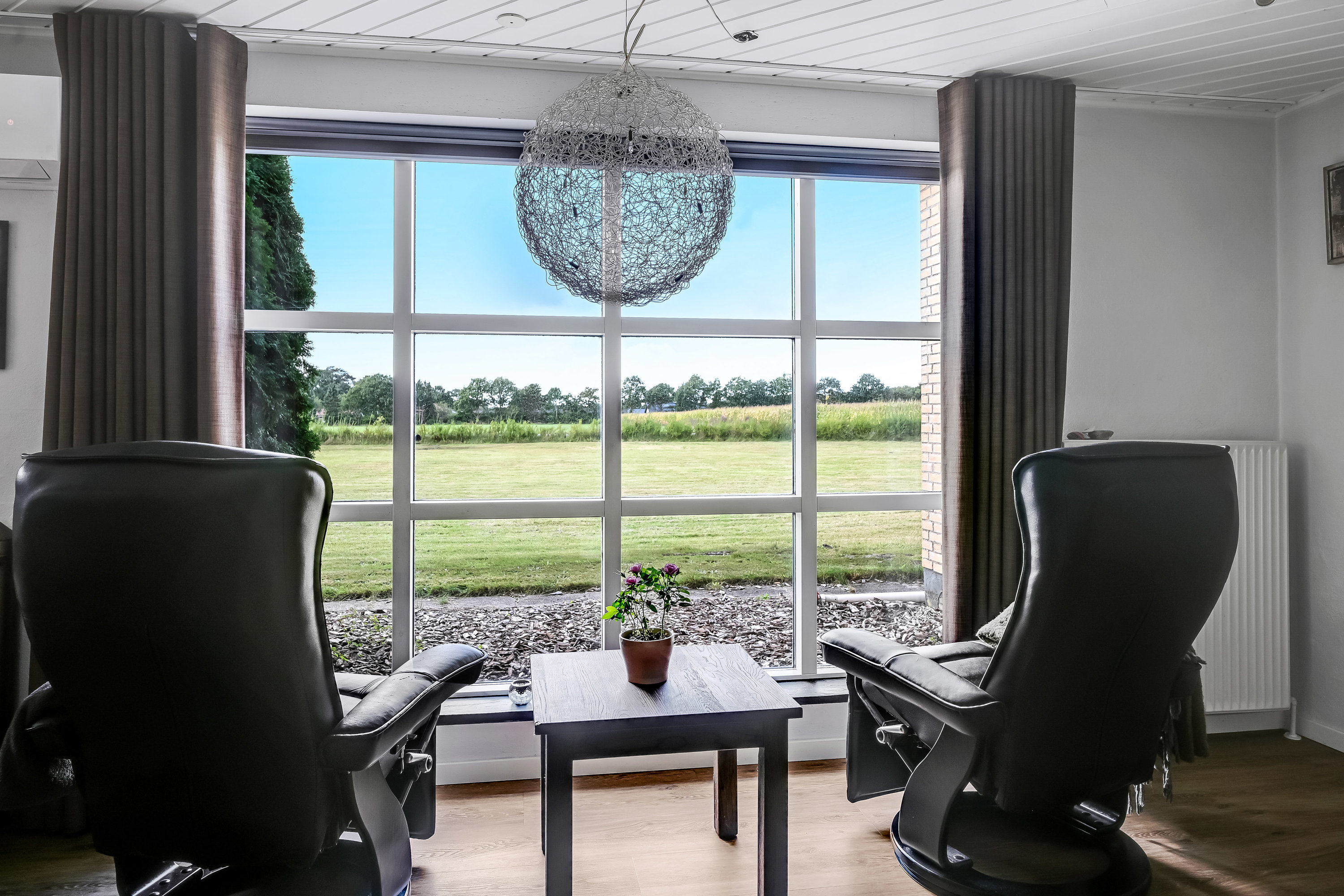 Her får du store opholdsrum med plads til både afslapning og selskaber. Stuen er lys og venlig med brede vinduespartier, der trækker naturen ind, og de nye gulve i hele huset skaber et sammenhængende og moderne udtryk. Køkkenet ligger i åben forbindelse til spisepladsen, så hverdagen glider let, og fra soveværelset er der både skabsplads og kig til de grønne omgivelser. Ejendommen rummer desuden flere værelser, to badeværelser samt et praktisk bryggers.
